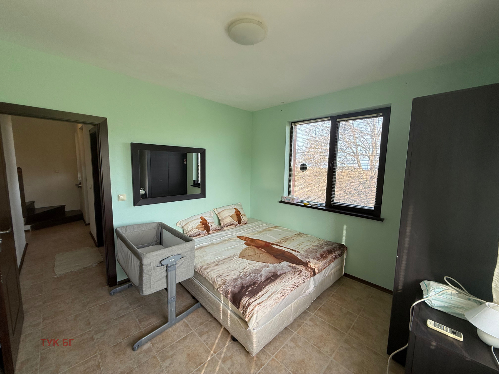 Трети етаж: Голяма, напълно обзаведена спалня с санитарен възел и тераса.
