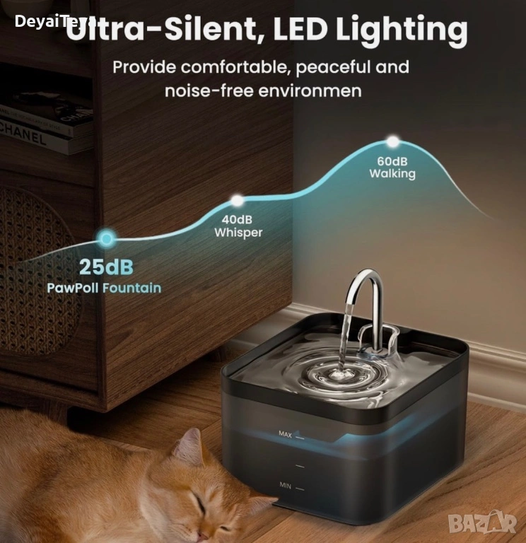 Фонтан за вода за домашни любимци PawPoll. Фонтан за вода за котки PawPoll. Супер тих: Фонтанът за котки е с подобрен мотор, енергоспестяваща и екологична водна помпа с мощност 1,5 W, която е супер тиха (≤ 25dB) и гарантира, че вие ​​и вашата котка можете да се насладите на спокоен нощен сън.