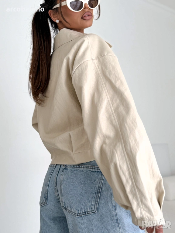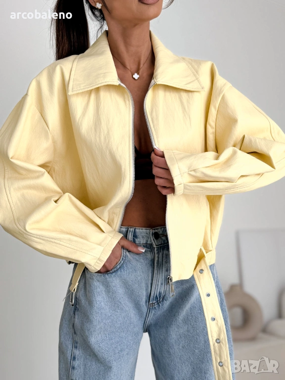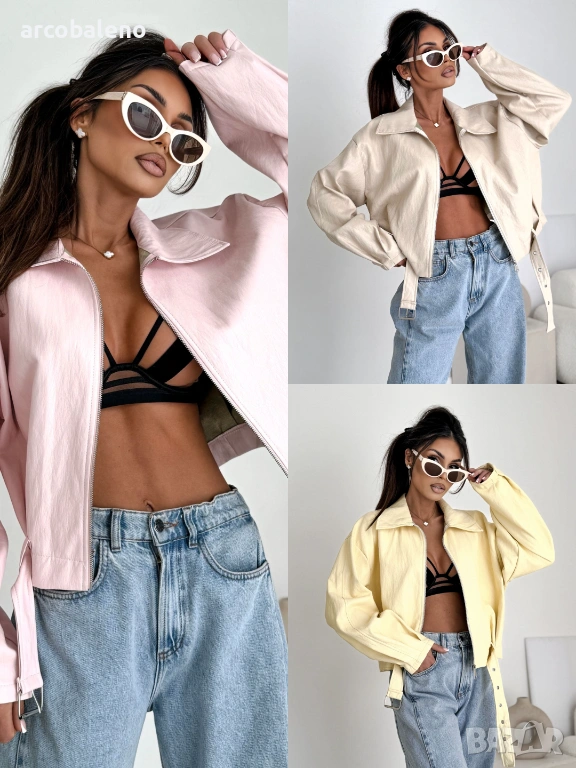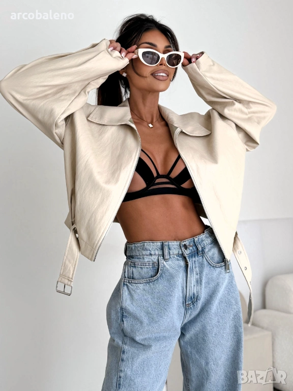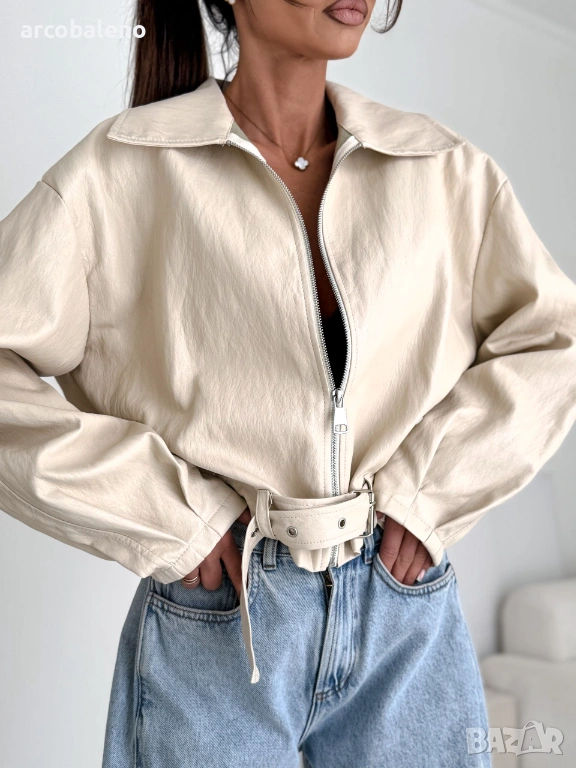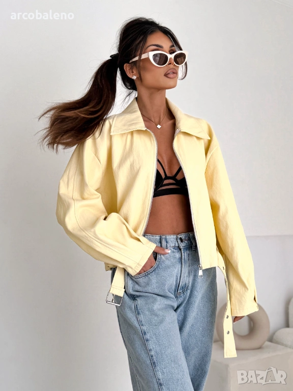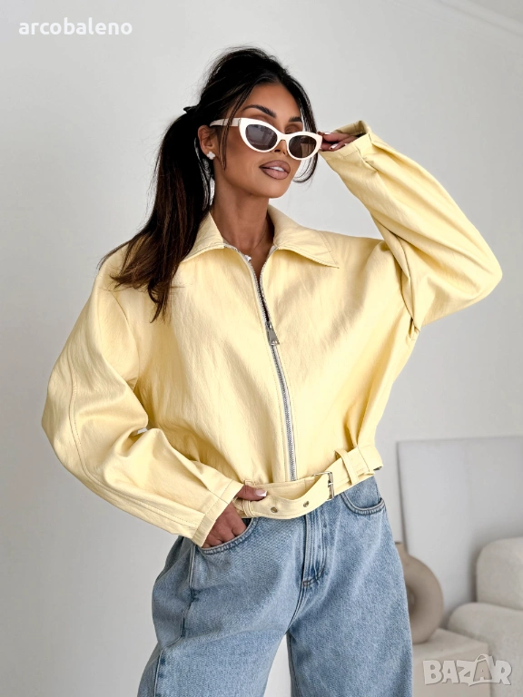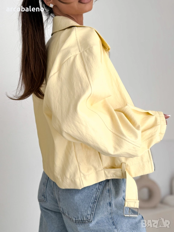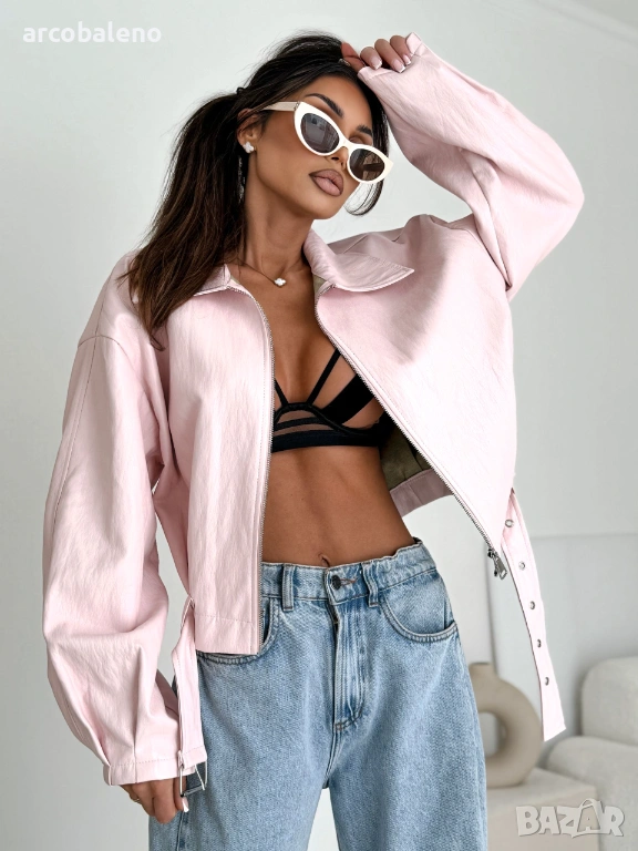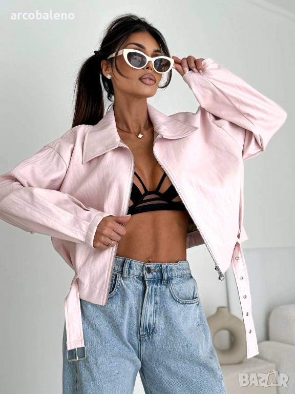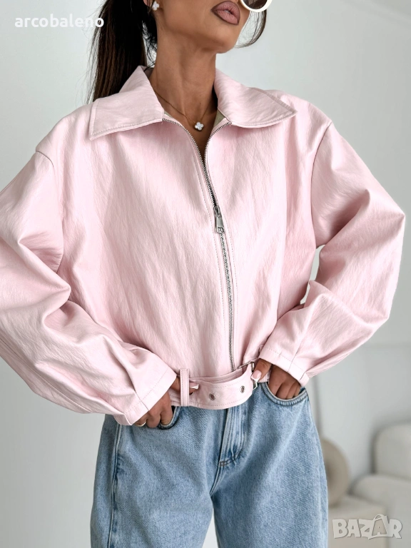 Модерно яке от изкуствена кожа в красив пастелни цветове. Късата кройка с яка и колан на талията добавя характер и красиво подчертава фигурата. Перфектно за пролетен стил - леко, стилно и много ефектно.