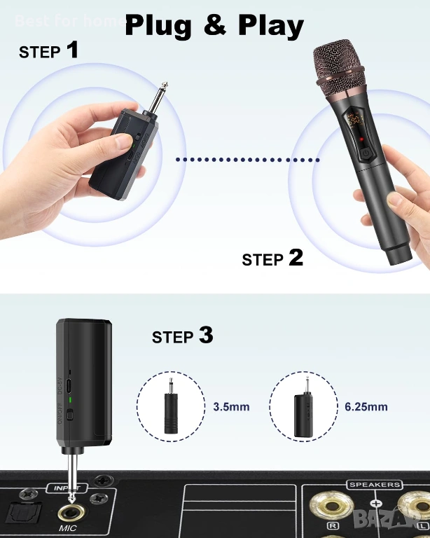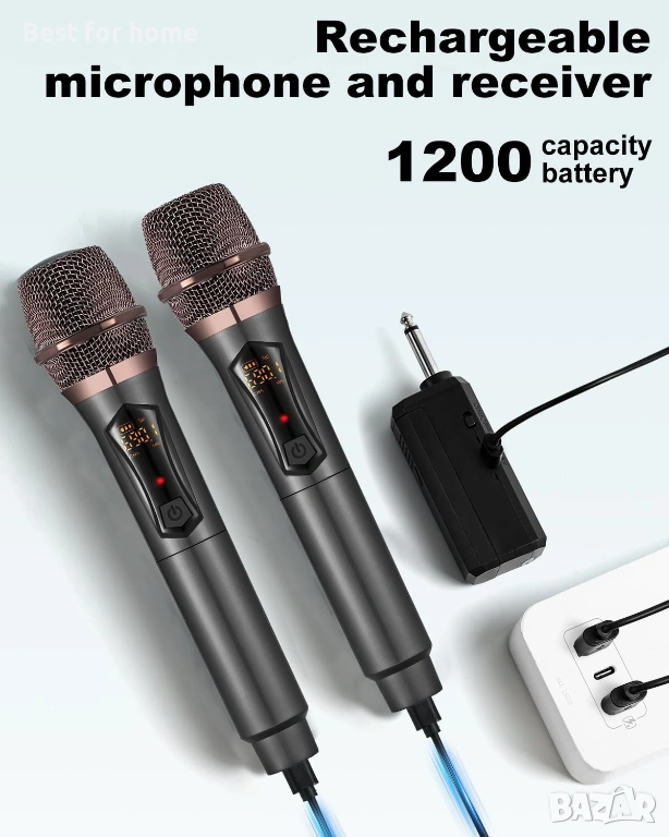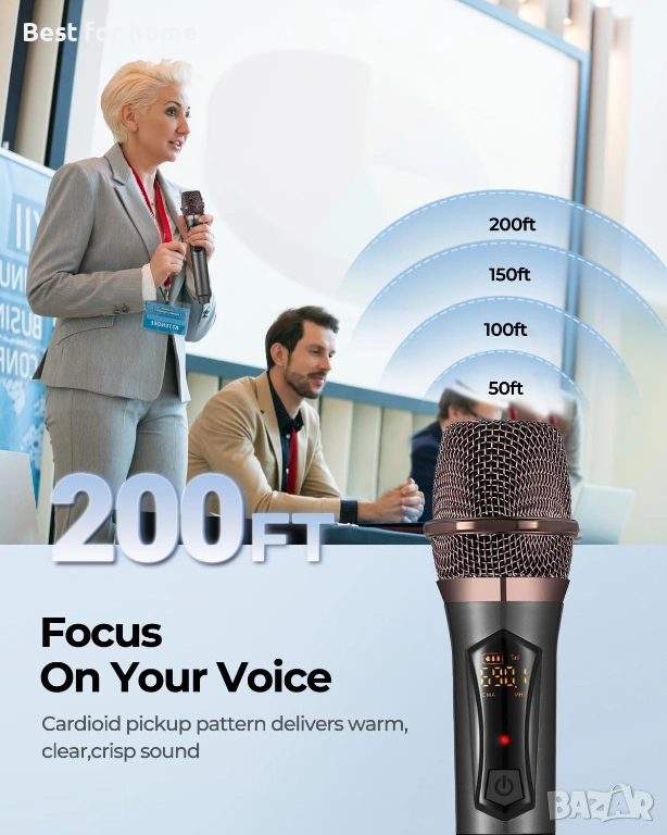 Подобрен безжичен микрофон - Безжичният микрофон актуализира честотата, което прави обхвата на връзката до 60 метра (200 фута). Той е изработен от високочестотна технология, която прави безжичния микрофон да има по-стабилен сигнал. Защитен от неправилно отваряне, 0 забавяне! Много подходящ за семейно караоке, църкви, сватби, конференции и малки сценични представления.