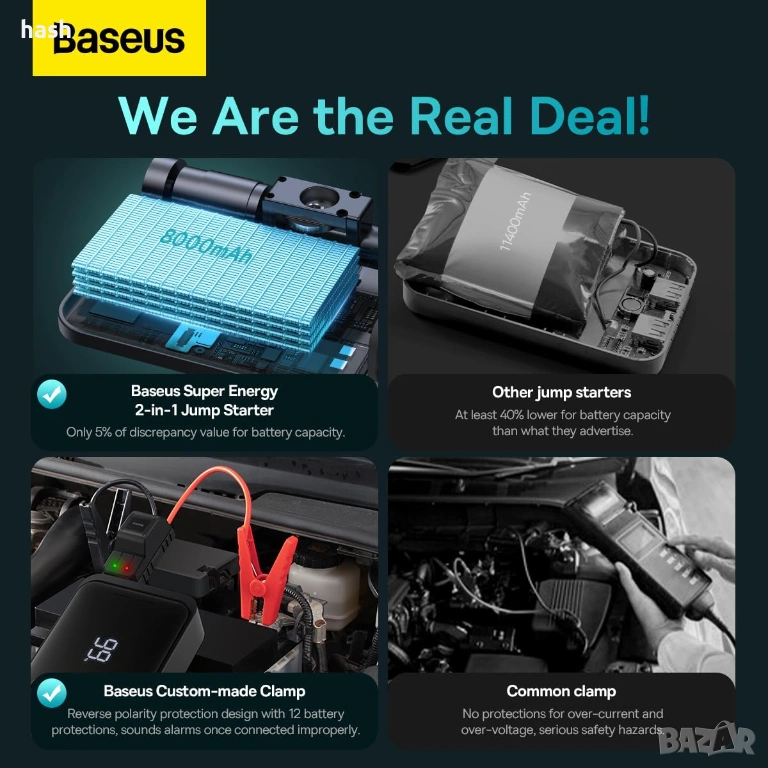 Многофункционално устройство, което съчетава стартер за автомобили, външна батерия и компресор за гуми. С капацитет на батерията от 8000 mAh и максимален ток на стартиране от 1000A, той е подходящ за стартиране на бензинови двигатели до 4.0 литра и дизелови двигатели до 2.5 литра. Устройството разполага с вграден компресор, който може да надува гуми до 150 PSI, както и с LED фенерче за аварийно осветление. Baseus CGCN000001 е идеален за използване при пътувания и аварийни ситуации, тъй като може да се използва и като външна преносима батерия и осигурява надеждност и удобство.