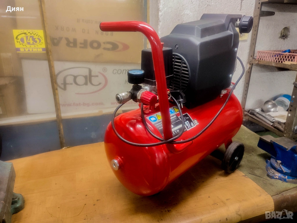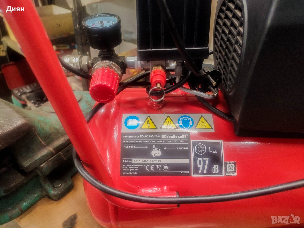 Продавам компресор Einhell TC-AC 190/24/8, 1.5 kW,2850 об./мин.Един цилиндър,работно налягане: макс. 8 бара,обем на бутилката 24 л.Компресора е в много добро състояние,тежи 21 кг.Изходящ дебит при 4 bar 76 л/мин. , при 7 bar 60 л/мин. Цена :100евро.