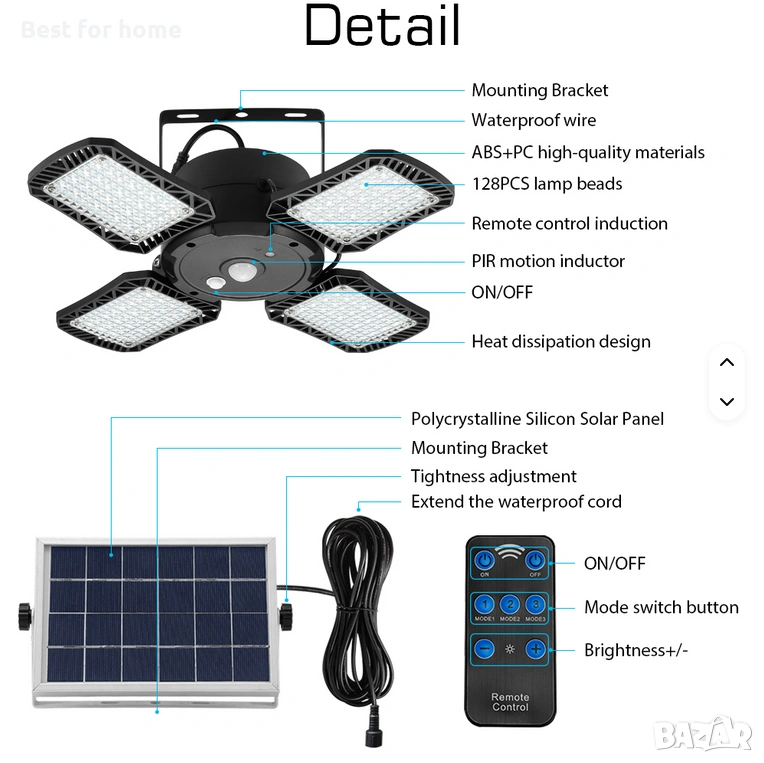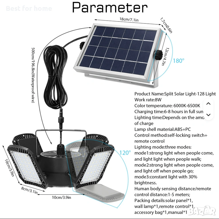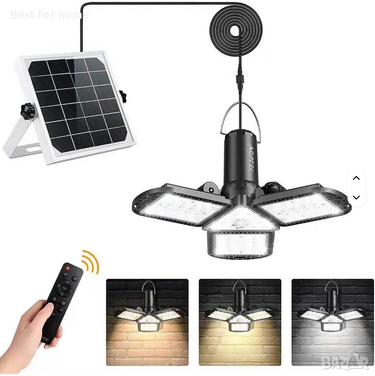 Слънчева лампа за вътрешна употреба, пълна вътрешна слънчева лампа за дома, сензор за движение с дистанционно управление, 128 LED/1000lm, IP65