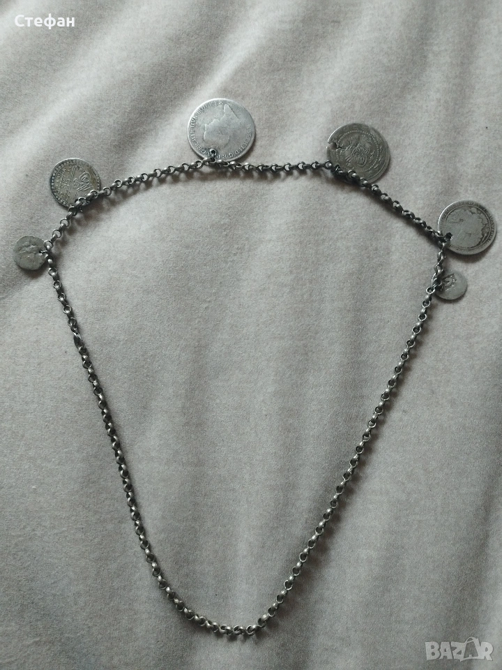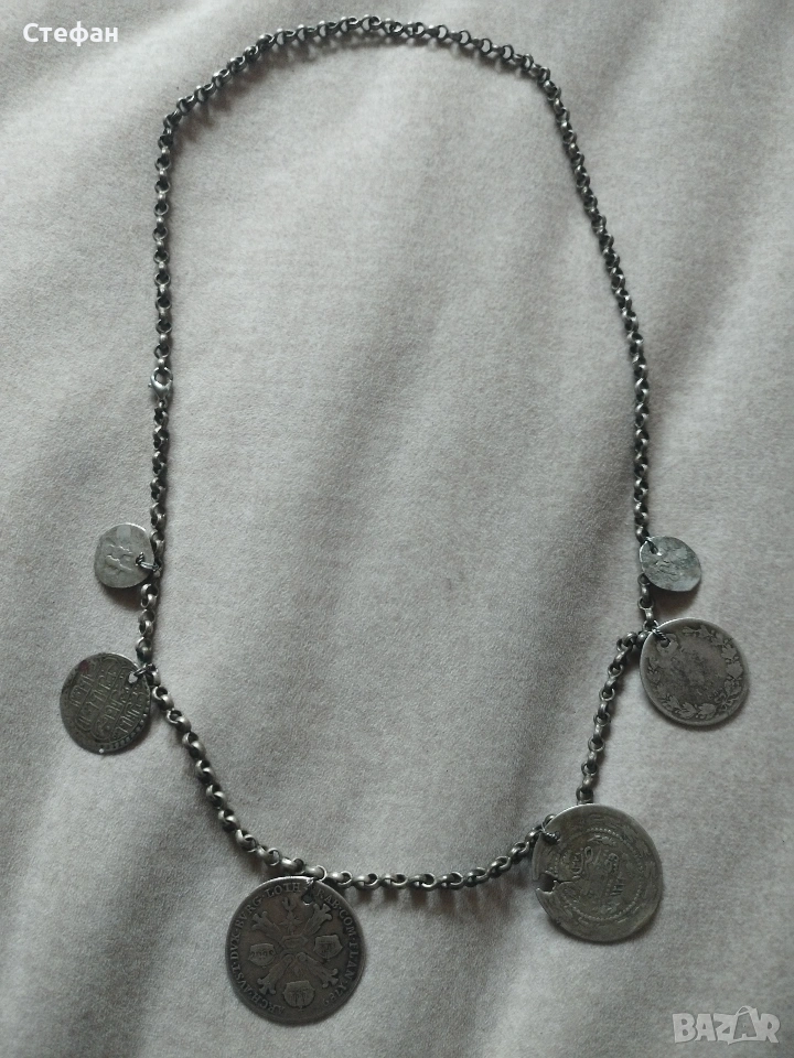 Дължината на синджира е 58см.Монетите и синджира са сребърни.
