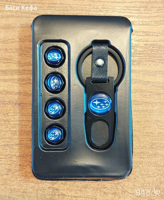 4 броя метални капачки за гуми с лого. Ключодържател с лого, който е и ключ за стягане.
