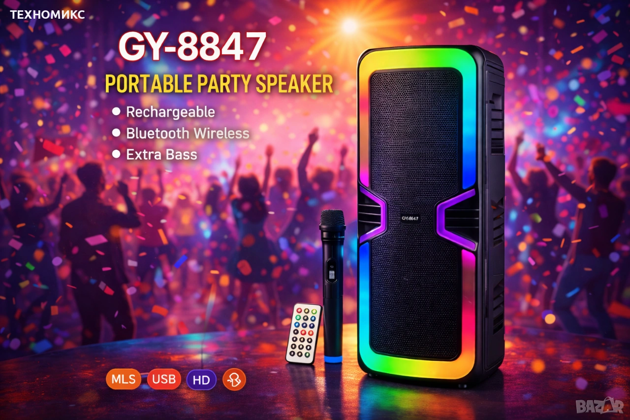 GY-8847 носи съвременни функции, които решават често срещани проблеми при избор на тонколона: липса на мощност, слаба свързаност и скучно осветление. Сред ключовите предимства са: