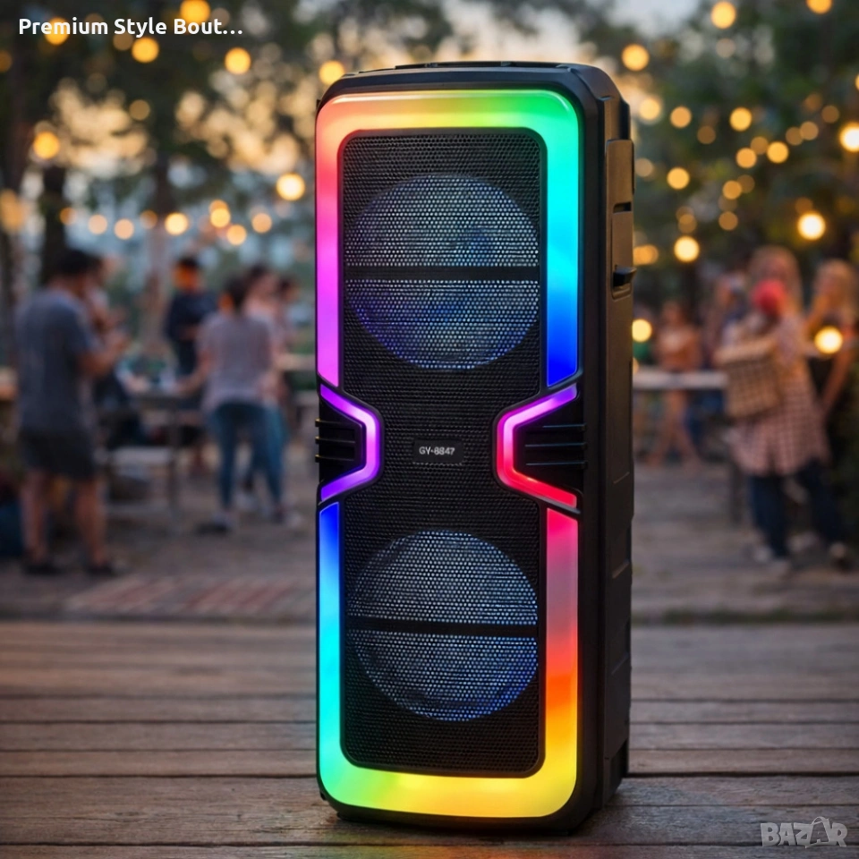 Bluetooth караоке тонколона GY-8847 с Led осветление е портативно аудио решение, което превръща всяко събиране в парти. С мощност 20W и двойни 8" бас говорители, този говорител доставя ясен звук с достатъчно дълбочина за домашни партита, градински събирания или улични изпълнения. Вградената батерия 3.7V 2400mAh осигурява часове възпроизвеждане, а разноцветните LED светлини създават динамична атмосфера, която следва ритъма на музиката. GY-8847 комбинира удобство и функционалност: Bluetooth свързване, USB и SD възпроизвеждане, FM радио, дистанционно управление и TWS възможност за двоен звук — перфектният избор за караоке и мобилни събития.