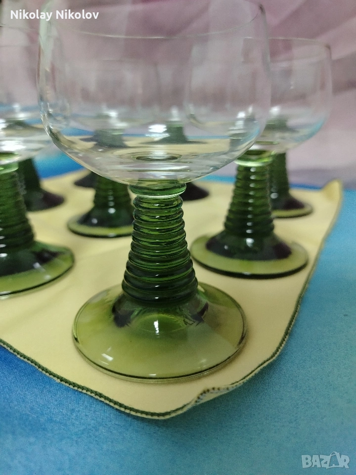 Комплект от 9 чаши с зелени крачета. Всяко парче има капацитет от около 140 мл и показва линия на пълнене 0,1 л, а под линията е монограм Z на компанията в квадрат. Тези чаши обикновено се използват за пиене на сухи и полусладки бели вина. Чашите имат традиционната и по-стара форма за този тип стъкло: кръгла форма на купа на дебело зелено конусовидно стъбло. Неползвани в ново състояние. Височина 10.5 сантиметра, диаметър на отвора 6.5 сантиметра, диаметър на основата 6.8 сантиметра.