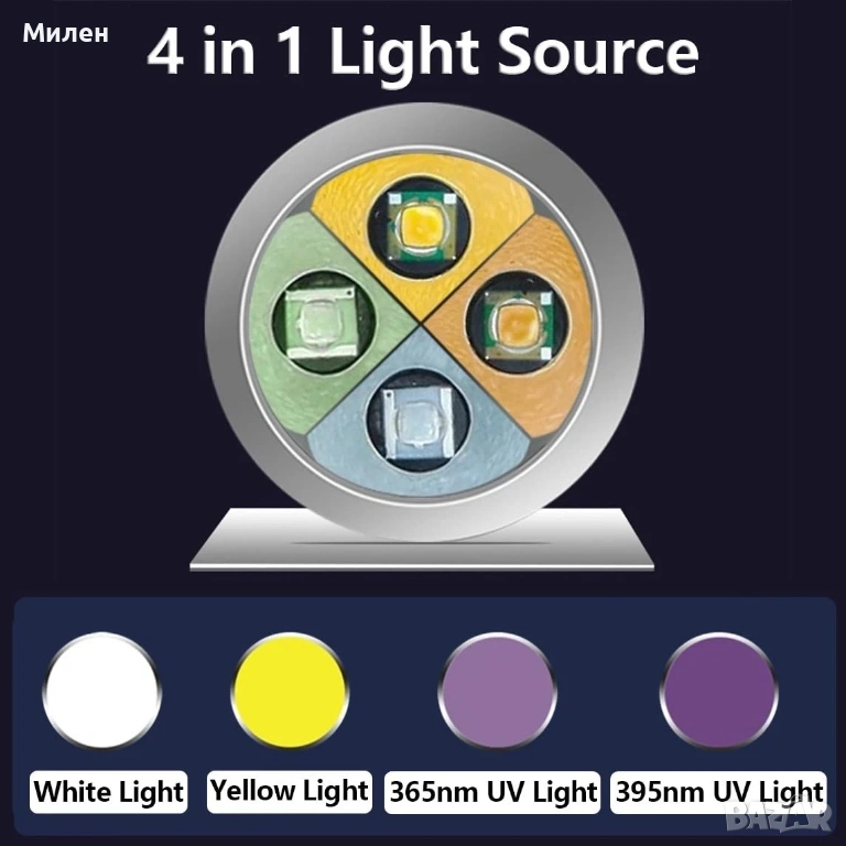 Разполага с четири режима: Бяла светлина, Жълта светлина, 365nm UV светлина и