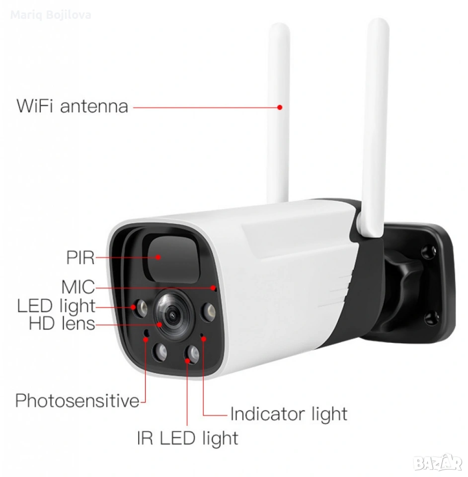 Камерата е с Full HD 1920x1080 резолюция и лещи от 4 мм., които осигуряват ясна картина с дълбочина на цвета от 128~4096 kbps. Вграден PIR сензор за движение автоматично засича движение и изпраща известия на вашето устройство, така че винаги да сте информирани.