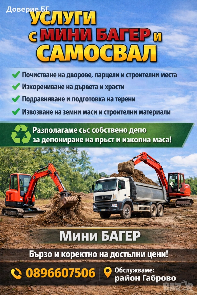 🚜 Услуги с багер и самосвал 🚛 Предлагаме: ✔ Почистване на дворове, парцели и строителни места ✔ Изкореняване на дървета и храсти ✔ Подравняване и подготовка на терени ✔ Извозване на земни маси, отпадъци и строителни материали ♻ Разполагаме със собствено депо за депониране на пръст и изкопна маса! Работим бързо, коректно и на достъпни цени. Подходящо за частни имоти, строителни обекти и земеделски площи. 📞 За информация и оглед: 0896607506