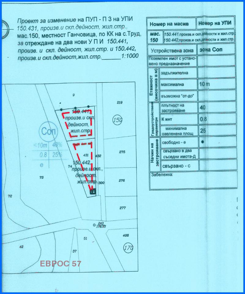 Оф.519 Стратегическо място за бизнес и живеене ! Ъглов парцел /УПИ с ПУП /, с разрешение за производствено-складови и жилищни нужди на последна спирка на Маршрутка 5 в с.Труд . В момента има малка къщичка с асма, с 3-фазен ток и вода, канализация, газификация, на асфалт с 3 лица. Без комисионна за купувача ! Възможна е продажбата и на 1637 кв.м.,или задният парцел включващ локален път. Ексклузив ! За огледи:0899/871 571 Румяна Василева и 0884/715 883 Василев.