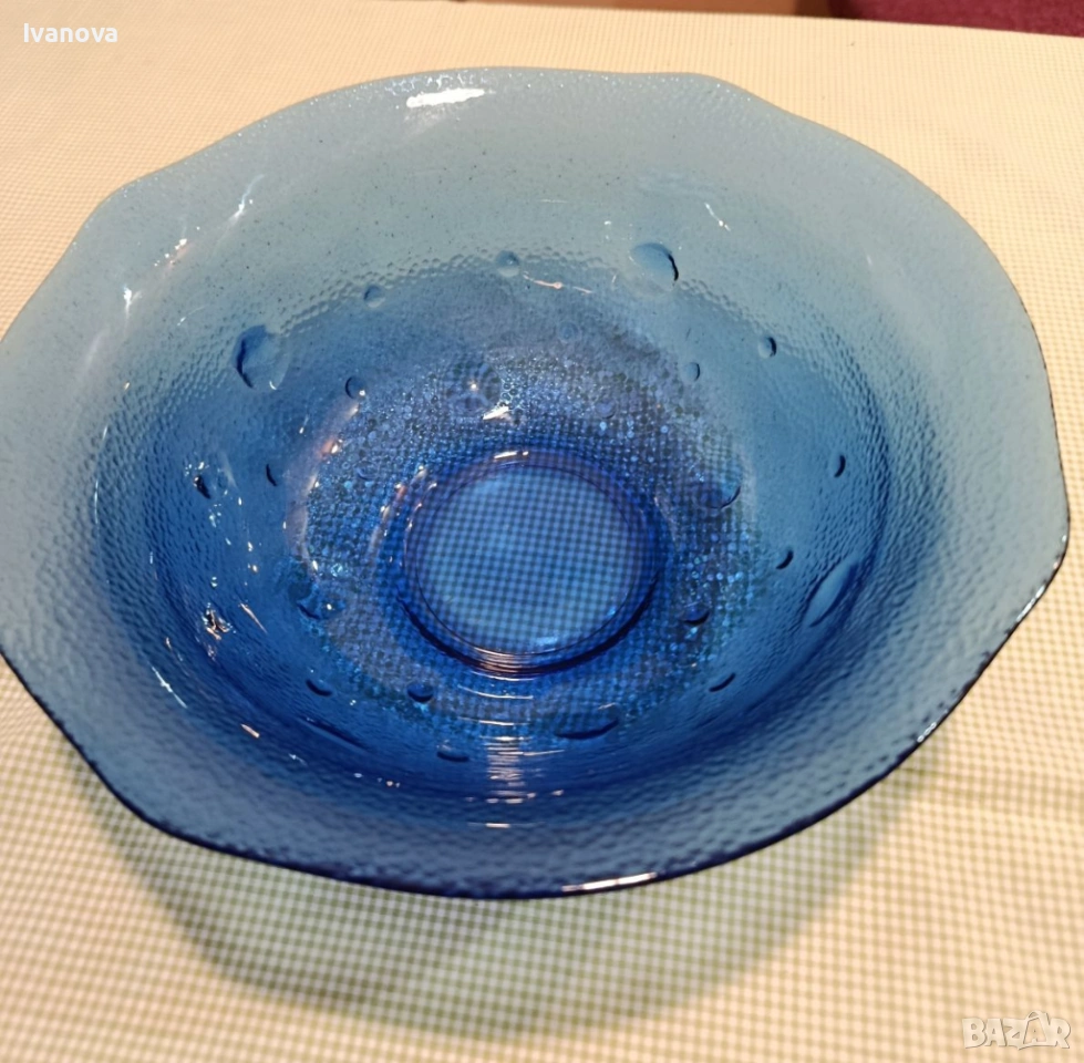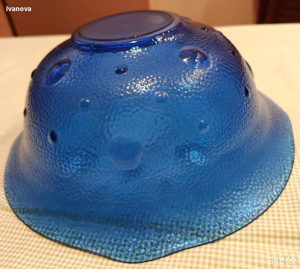 синя стъклена купа нова от финно стъкло, ръчна изработка за салати, плодове и
