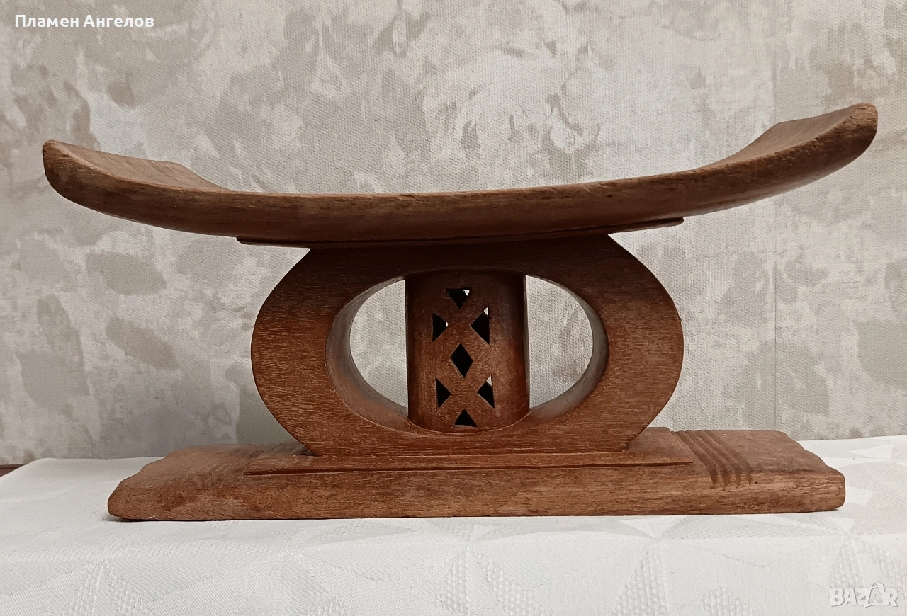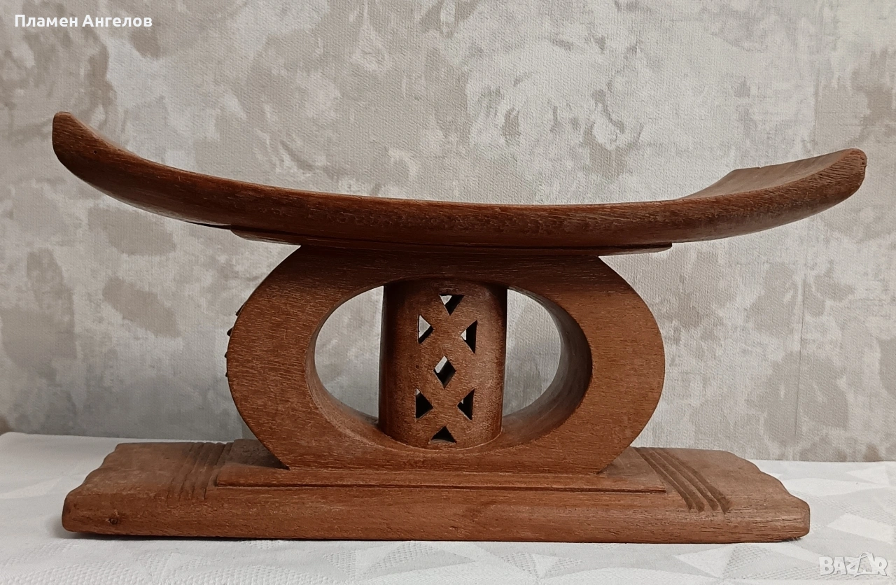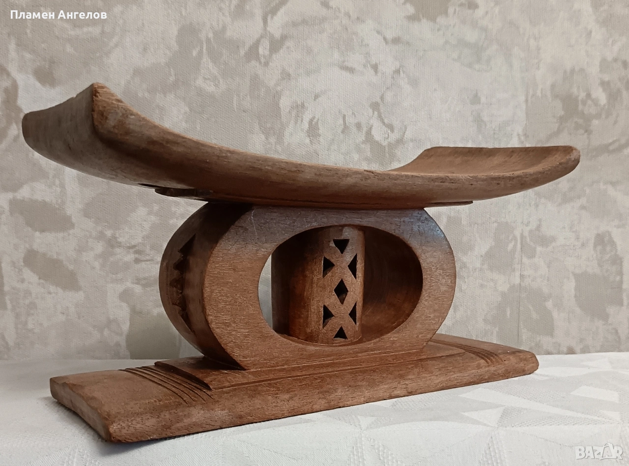 Автентично, традиционно столче, табуретка Ашанте /Асанте от Гана Западна Африка. Известен вид изкуство в културата Акан. Служат като културни символи, представящи душата на общността и се съхраняват като свещенни предмети. Изработени ръчно, ръчно резбовани от еденичен блок масивно дърво от Махагон. Често се срещат и от Тик или Сесе. Ръчно издълбано със сложни модели в централната колона. Изработено от цяло дърво, без сглобки, без лепило, без пирони, това са признаци за автентичност.