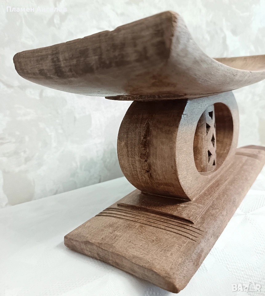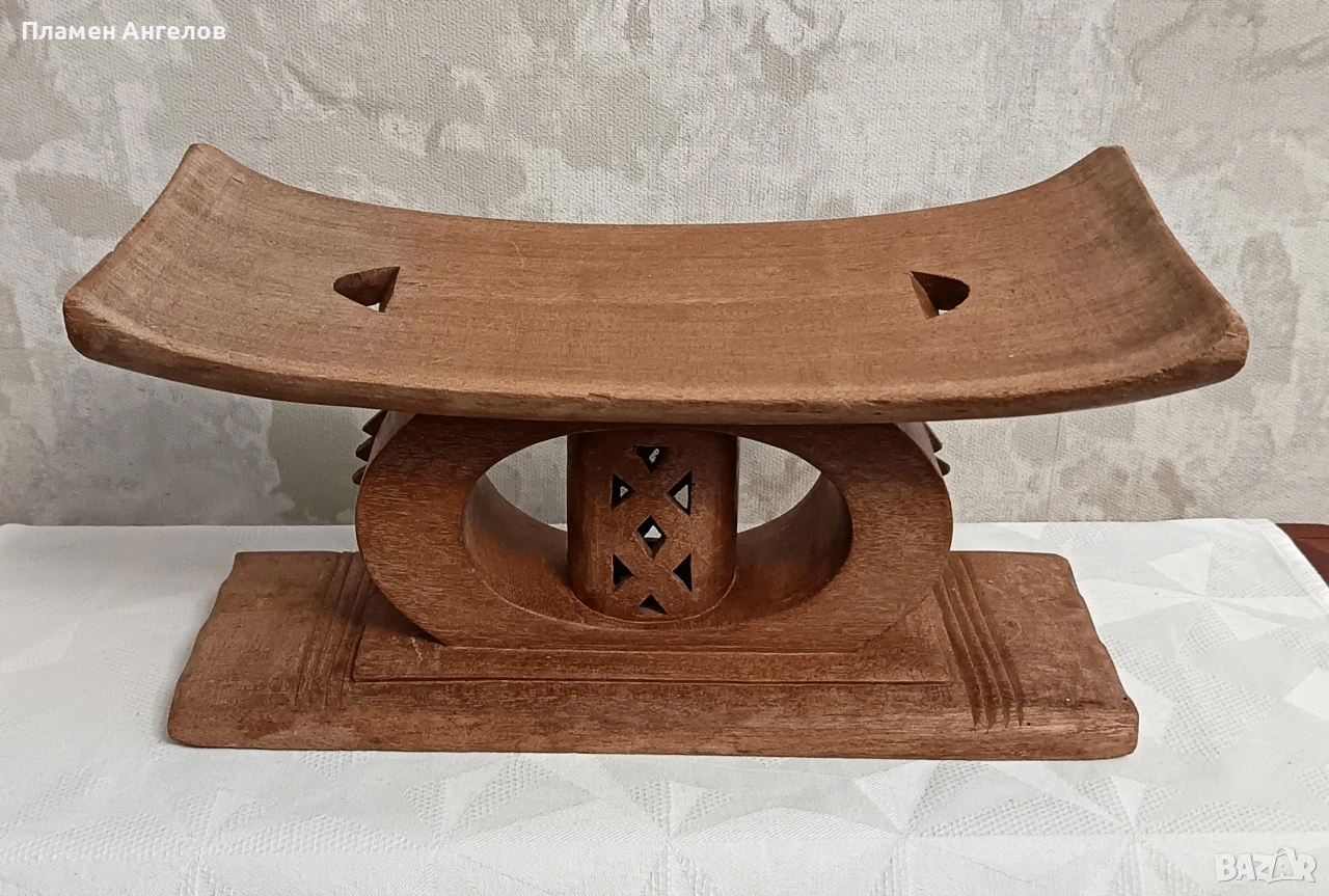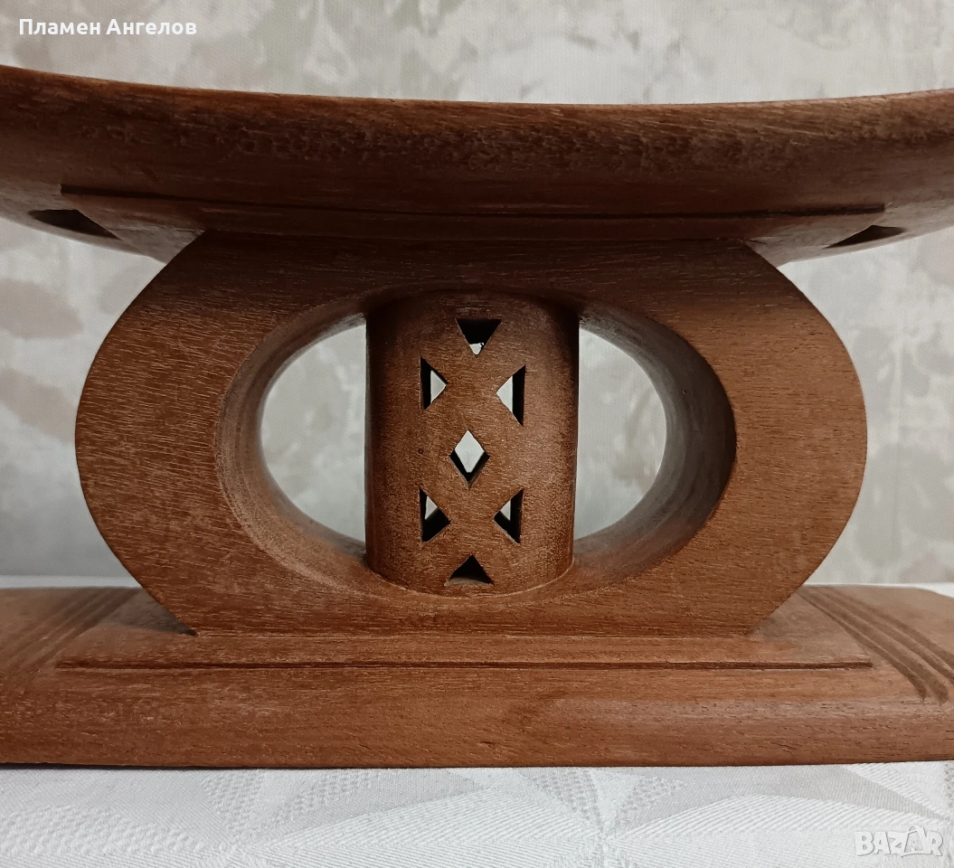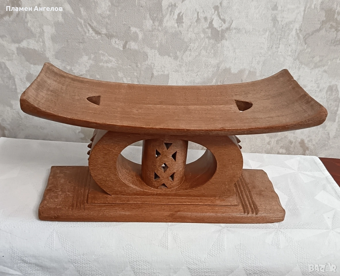 Автентично, традиционно столче, табуретка Ашанте /Асанте от Гана Западна Африка. Известен вид изкуство в културата Акан. Служат като културни символи, представящи душата на общността и се съхраняват като свещенни предмети. Изработени ръчно, ръчно резбовани от еденичен блок масивно дърво от Махагон. Често се срещат и от Тик или Сесе. Ръчно издълбано със сложни модели в централната колона. Изработено от цяло дърво, без сглобки, без лепило, без пирони, това са признаци за автентичност.