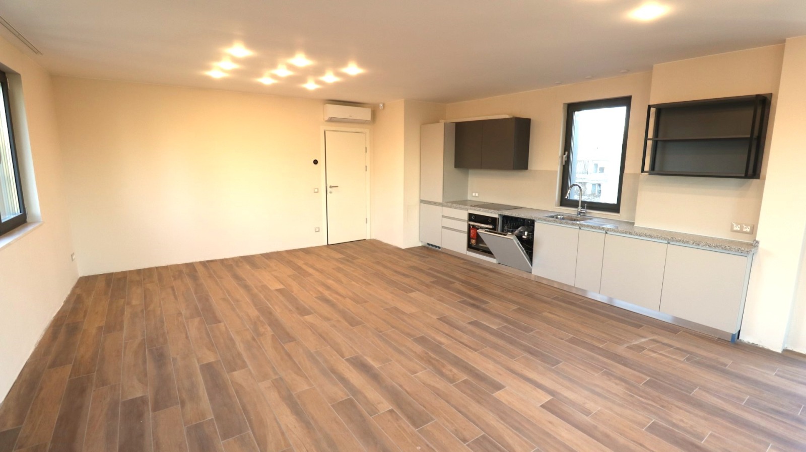 Състои се от антре, огромен хол с оборудвана кухня, две спални, кабинет, две бани, два балкона.