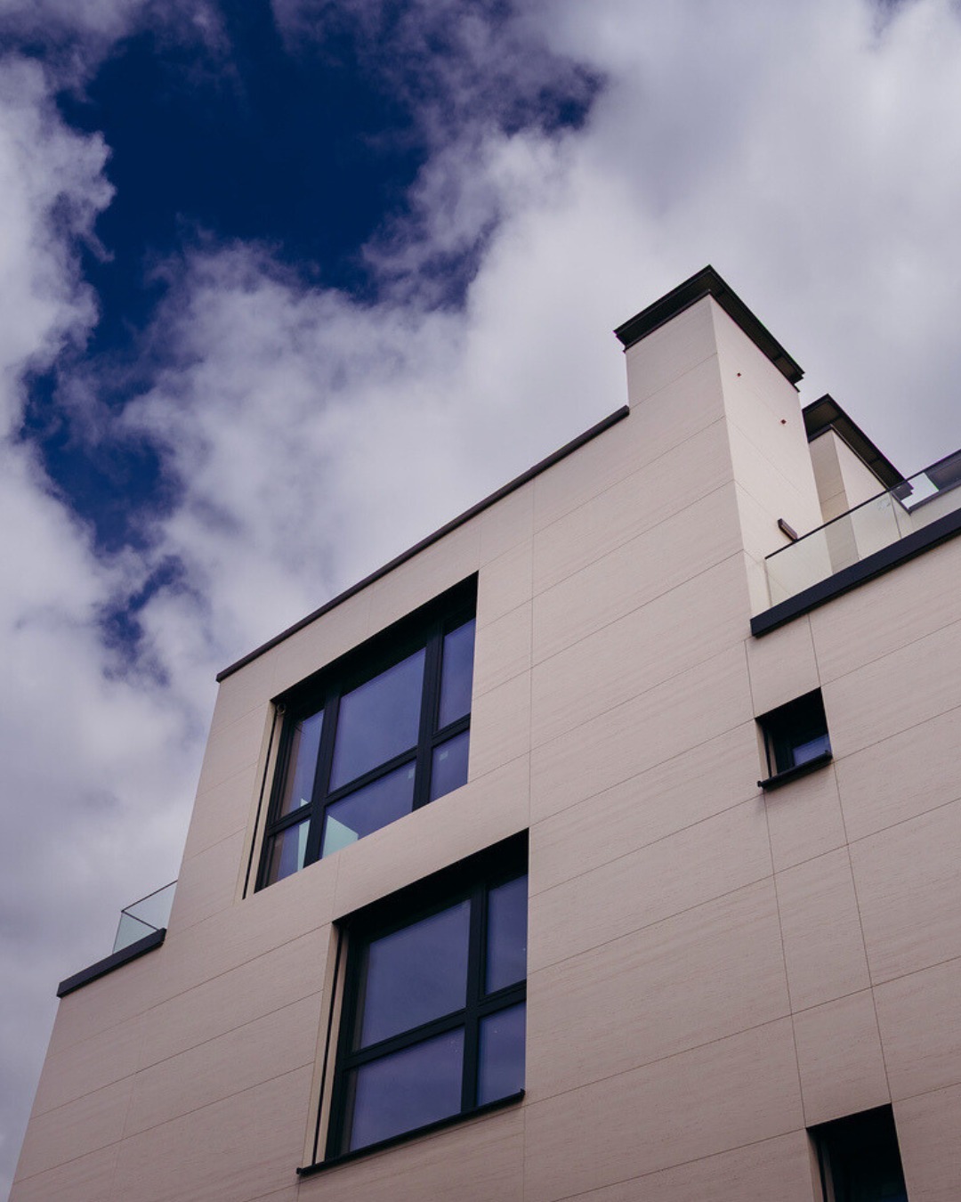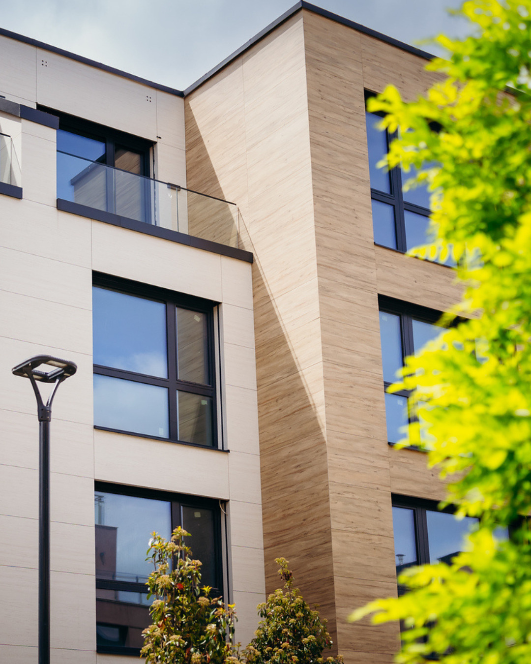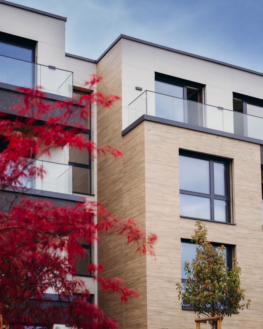 -Вентилируема фасада с ЛАМИНАМ и 4-ен стъклопакет дървена дограма с алуминиева капачка