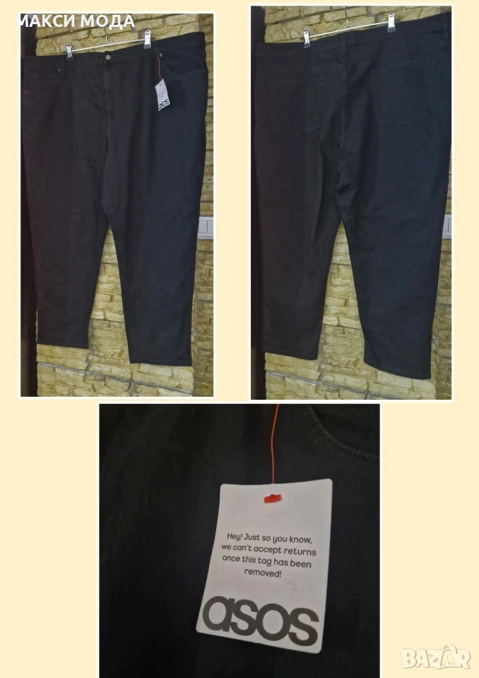 Нови! ГОЛЯМ РАЗМЕР 7/8 ХЛ Марка ASOS USA Размер по етикет EU 54 UK 26, съответства на 7/8ХЛ Цвят черен Закопчаване с цип Меки, класически деним Талия от 120 до 138 см Ханш от 138 до 150 см С голяма еластичност Мерките са дадени в свободно и разпънато състояние Дълбочина 37 см Бедра обиколка 80/98 см Крачолите долу са с обиколка 40/46 см Дължина 103 см 18€