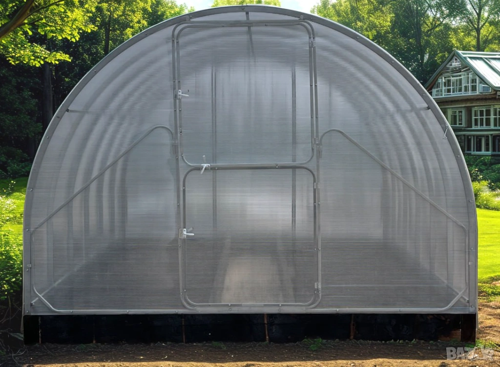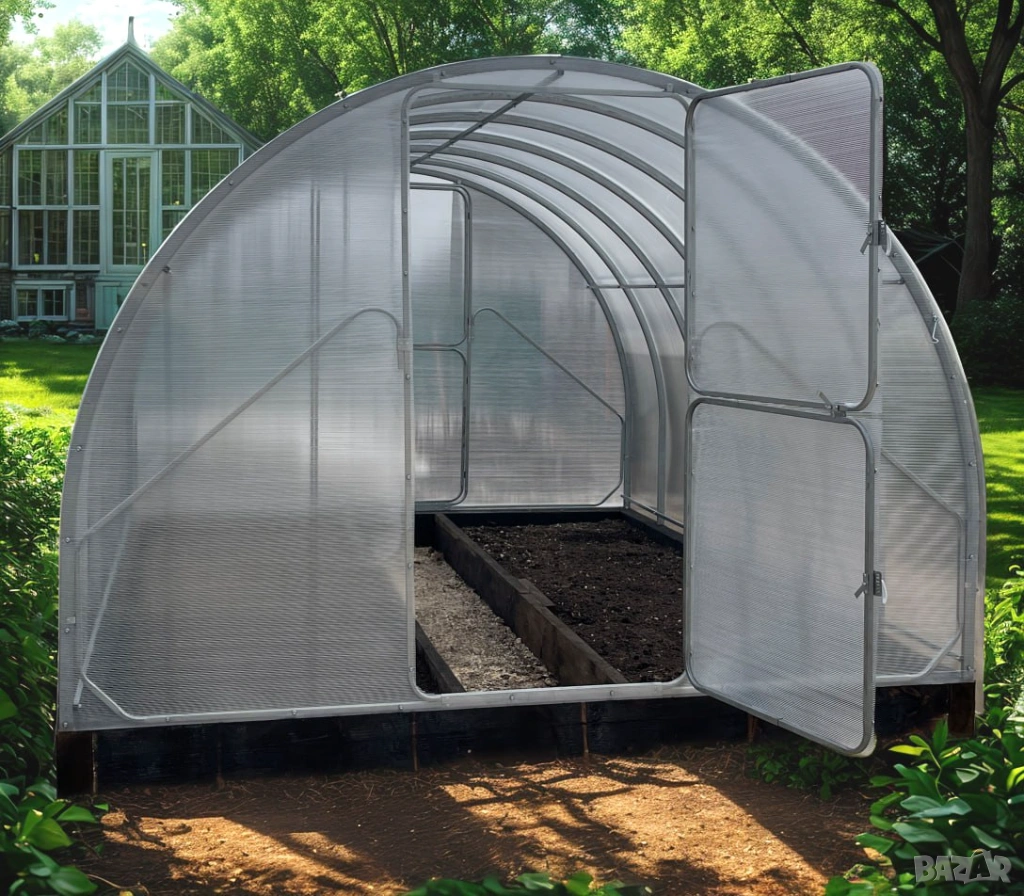 Покритието е от 4 мм поликарбонат с UV защита, който предпазва растенията от студ, вятър и силно слънце.