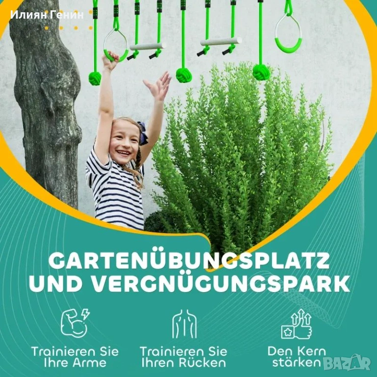Безкрайни приключения с цип линия: Този обширен комплект с цип линия включва два метални пръстена, два пръта и три топки за захващане, предлагащи множество възможности за игра в градината, като люлеене, катерене и хващане.