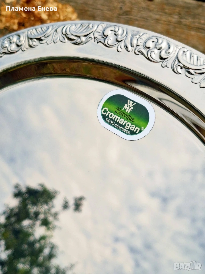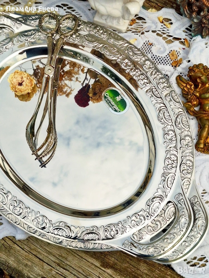 Представям комплект от два изящни подноса на немската марка WMF, изработени от висококачествена неръждаема стомана Cromargan серия "Барок". Подносите са с елегантна гравирана периферия и удобни дръжки – много стилни и практични !