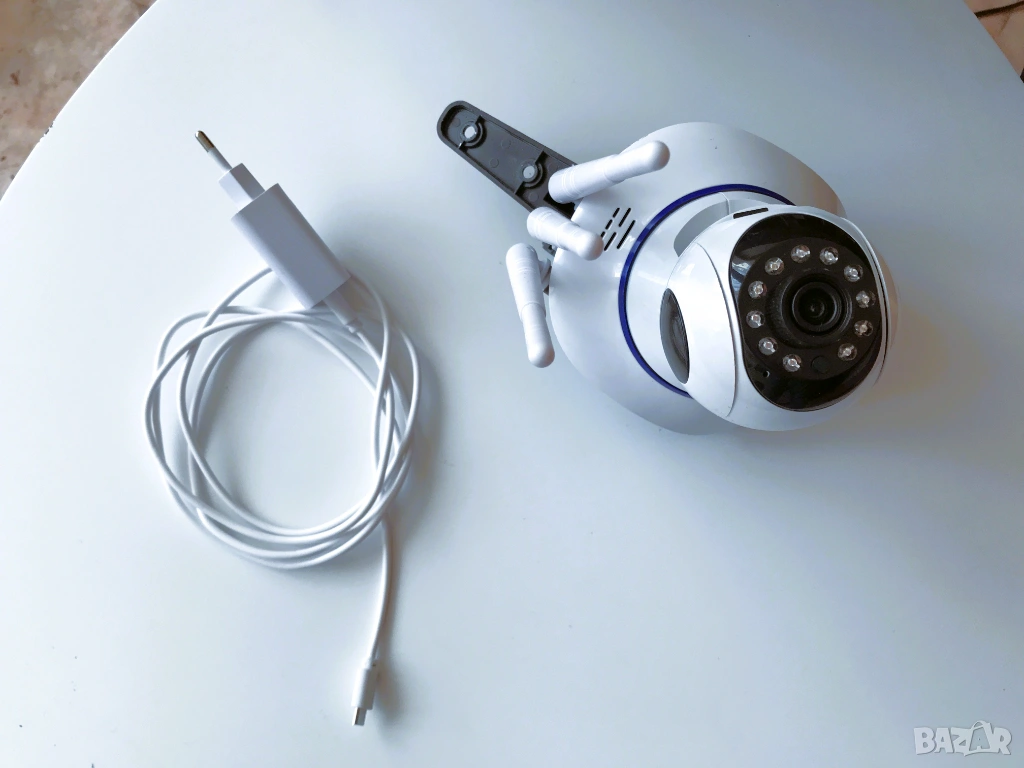Камерата е ползвана 2 месеца, 128 GB SAMSUNG EVO памет карта подарък. Контролира се с приложение през телефона. Може да записва на cloud освен на памет картата. Има аларма, запис на звук, и можете да говорите през камерата дистанционно (през телефона ви).