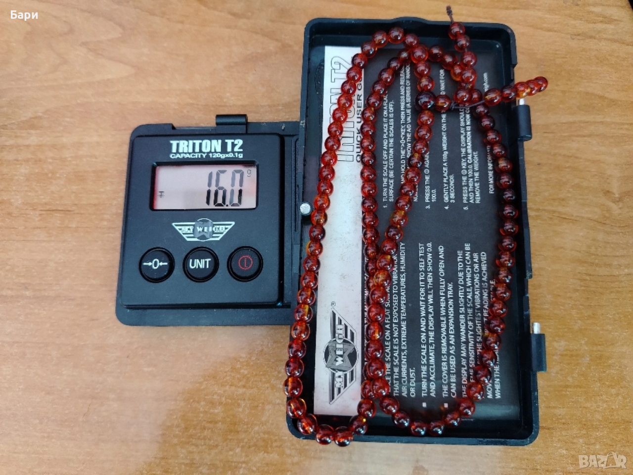 Размер:дължина двоен 36 см.,диаметър на зърната около 0,06 см,тежи 16 гр.,конеца е еластичен.