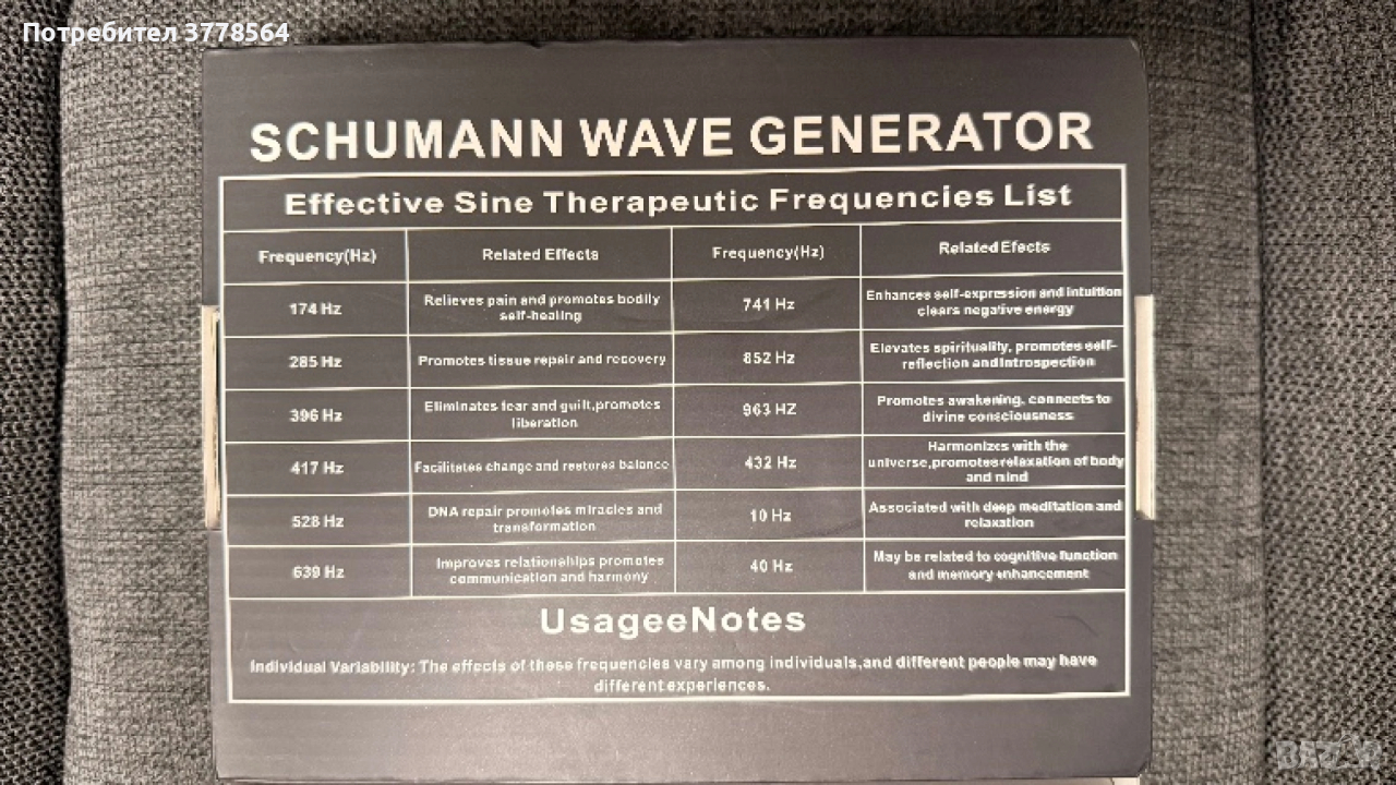 Насърчаване на физическото и психическото здраве, нашите генератори на Шуманови вълни 7,83Hz излъчват стандартна Шуманова резонансна честота от 7,83Hz, която помага за облекчаване на стреса, подобряване на качеството на съня, укрепване на имунитета и умствената концентрация. Могат да бъдат зададени няколко честотни точки, които са полезни за човешкия организъм, като например 0,83, 6,5, 7,83, 14,3, 20,8, 27,3 и 33,8 Hz.
