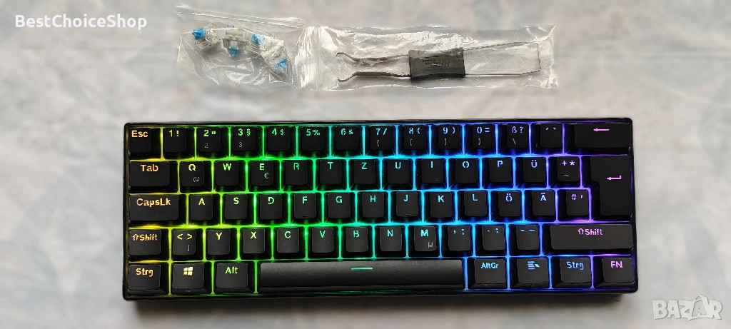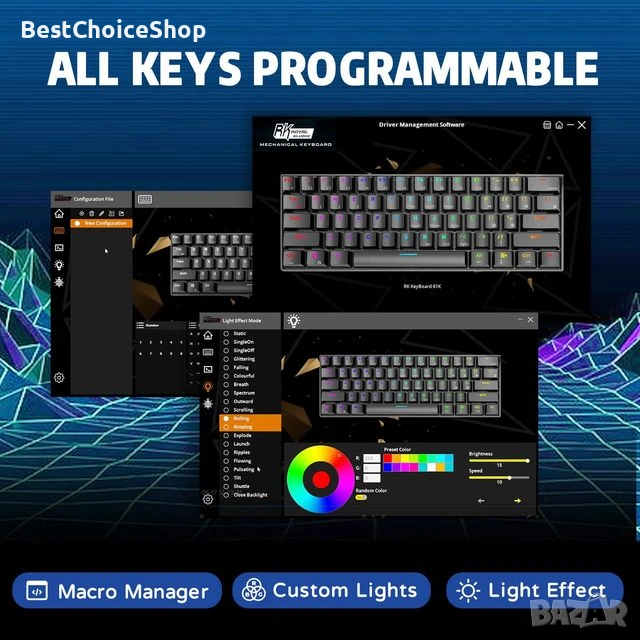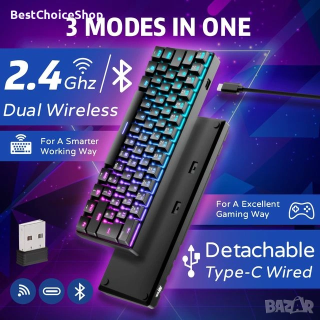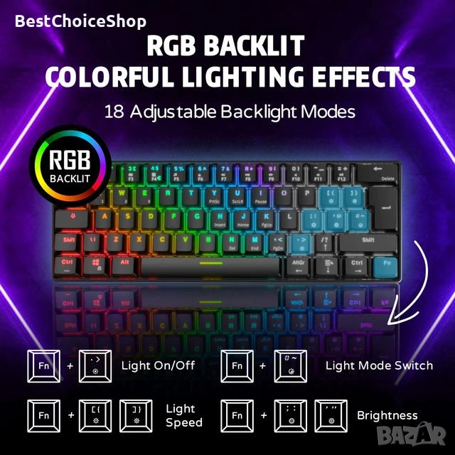 - RK61 RGB клавиатура и QMK/VIA програмируема: Тази 60% RGB клавиатура има 18 RGB режима на подсветка, 8 монохромни режима на подсветка и 1 пълноцветна подсветка. Тези режими ще ви осигурят по-голямо удоволствие, когато играете или пишете през нощта. С програмируемия QMK/VIA RK софтуер можете да персонализирате клавиатурата си по най-добрия начин.