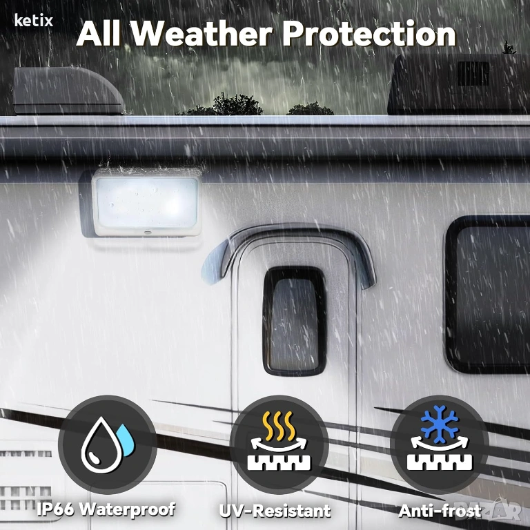 Водоустойчивост IP65 Тази нова веранда лампа за кемпер е напълно запечатана със смола, за да се гарантира, че водата няма да проникне в лампата или да пречи на осветлението. Допълнителните водоустойчиви уплътнения подобряват дренажа и издръжливостта, осигурявайки безопасност по време на вашите приключения с вашия кемпер или каравана.