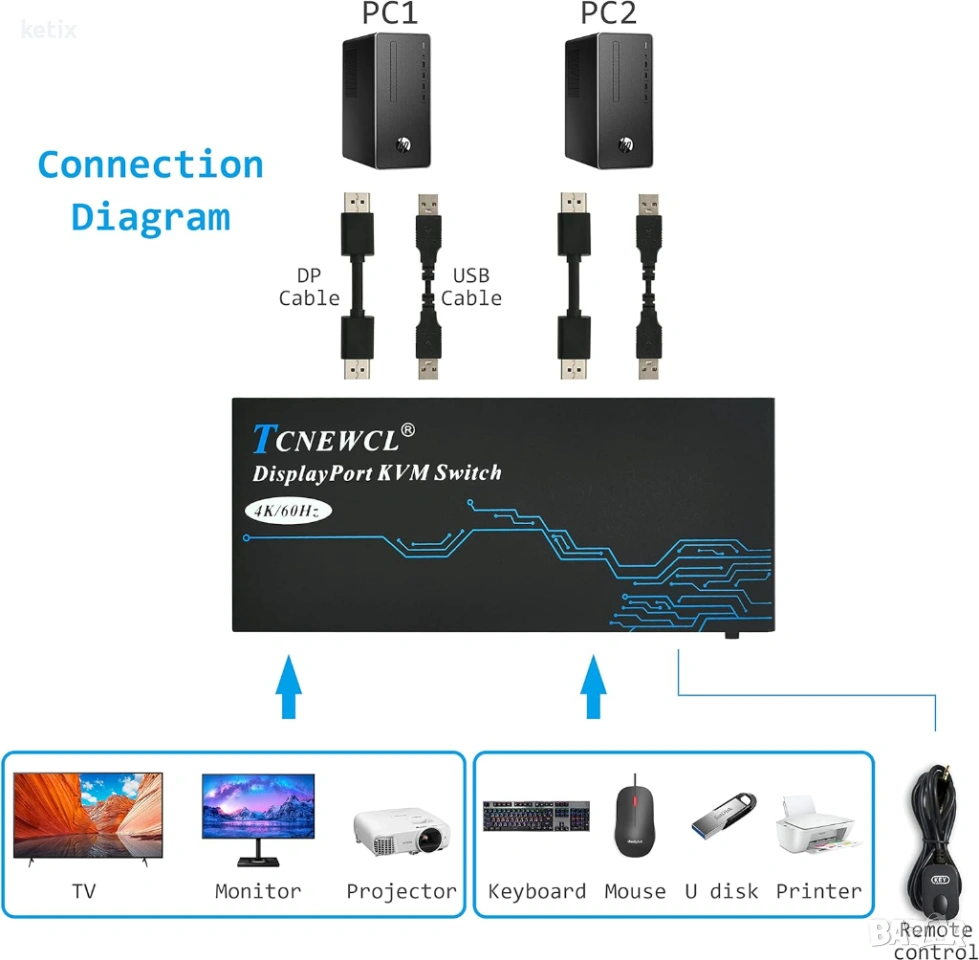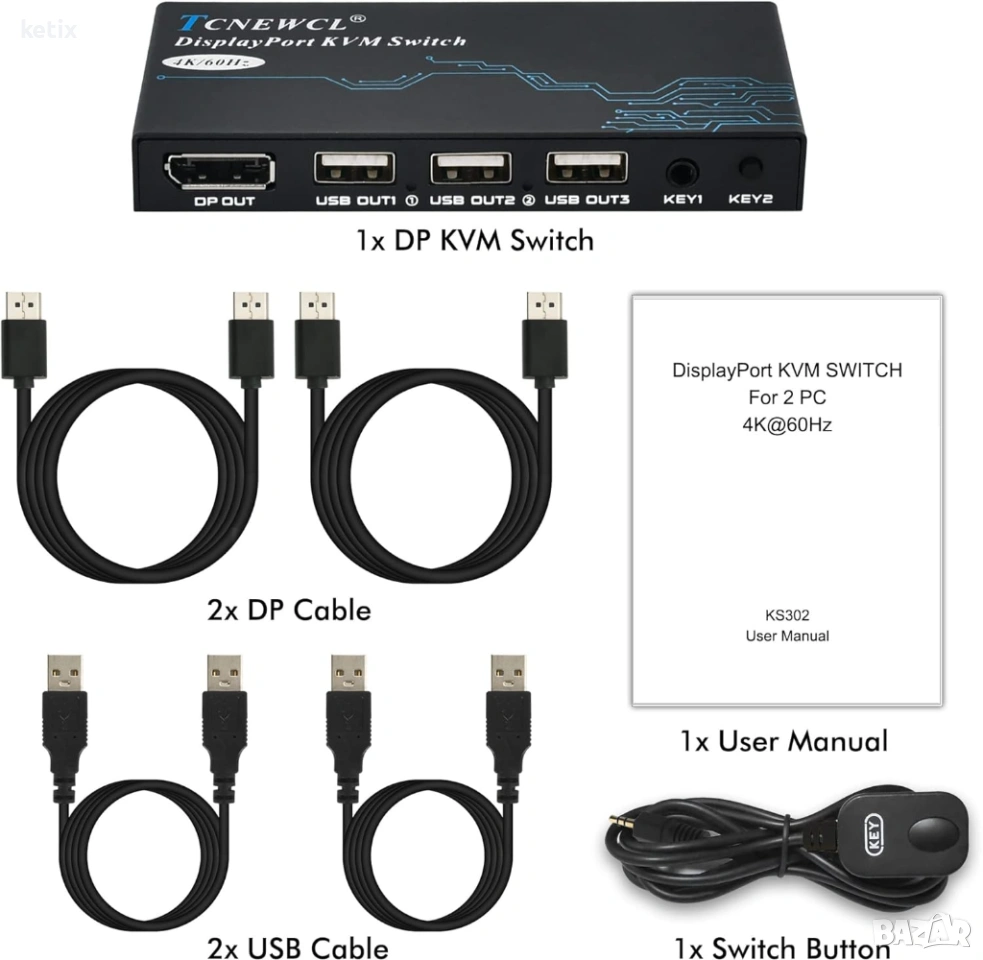 DisplayPort KVM превключвател: TCNEWCL 2-портовият DP KVM превключвател се използва за 2 Displayport компютъра, за да споделят 1 монитор и USB 2.0 устройства (като клавиатури, мишки и принтери), като по този начин спестява място на бюрото и разходи за оборудване.