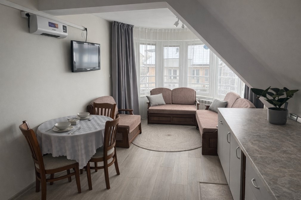 Имотът е обзаведен, с площ 50 кв.м, на 5-ти етаж от 5 етажа в сграда с асансьор. Разпределението включва входно антре, дневна с кухня и трапезария, спалня, баня с тоалетна и тераса.