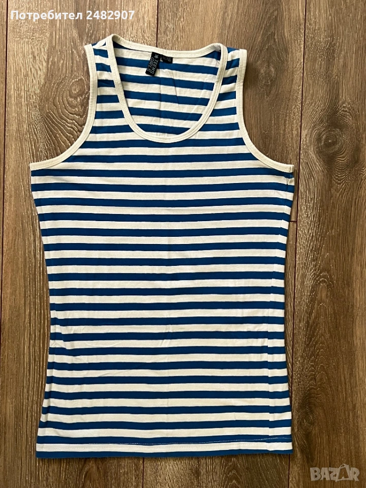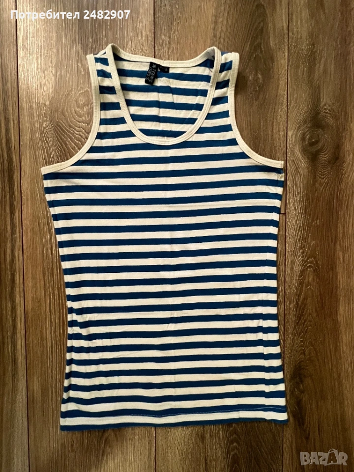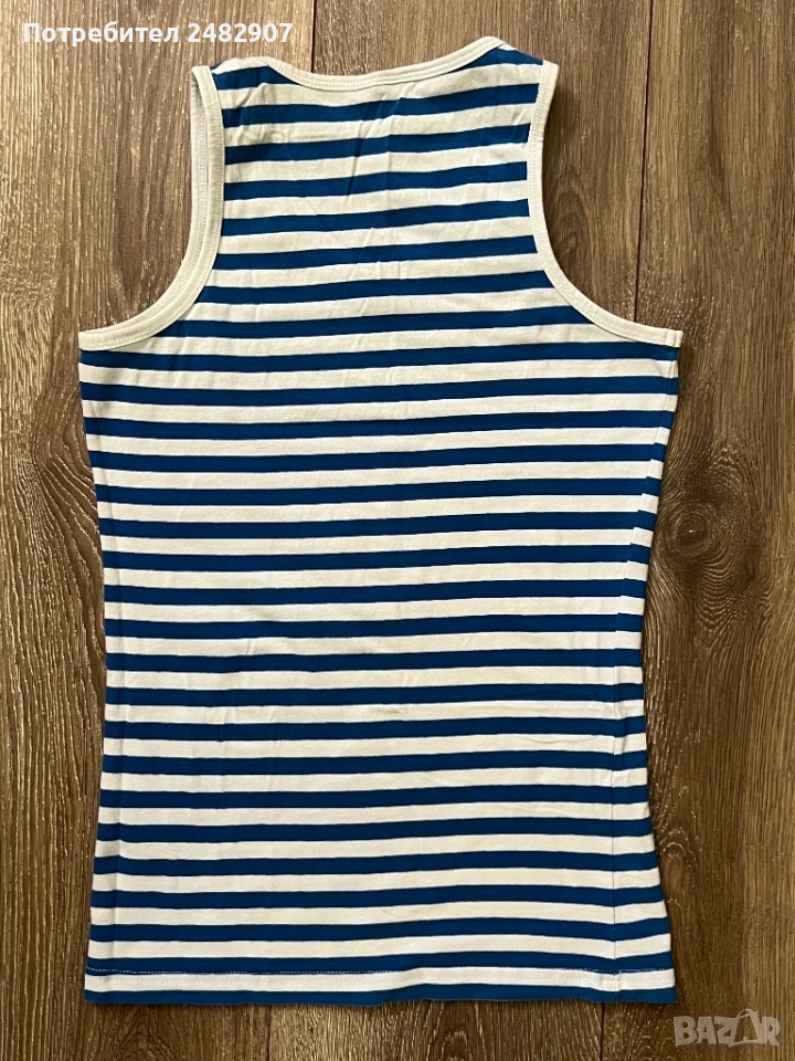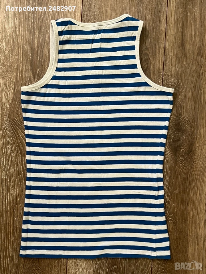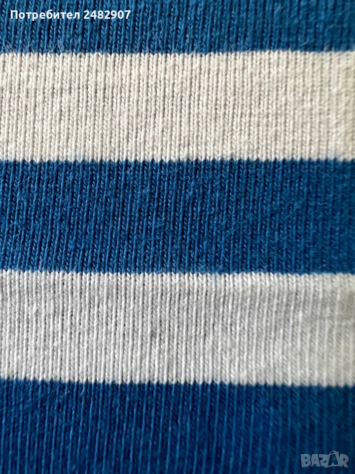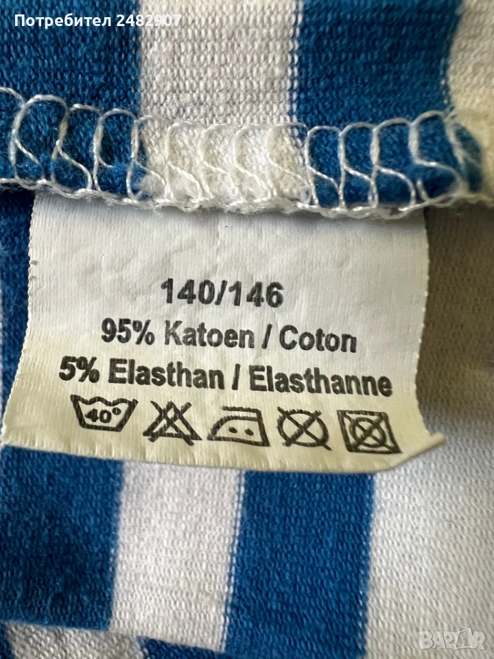 Раиран детски потник в бяло и синьо за ръст - 146 см. Съдържа 96 % памук и 5 % еластан. Ширина в раменете - 21 см, ширина под мишниците - 35 см, ширина в долната част - 34 см, дължина от рамото до долу - 57 см. Много запазен, почти не е използван, без забележки.