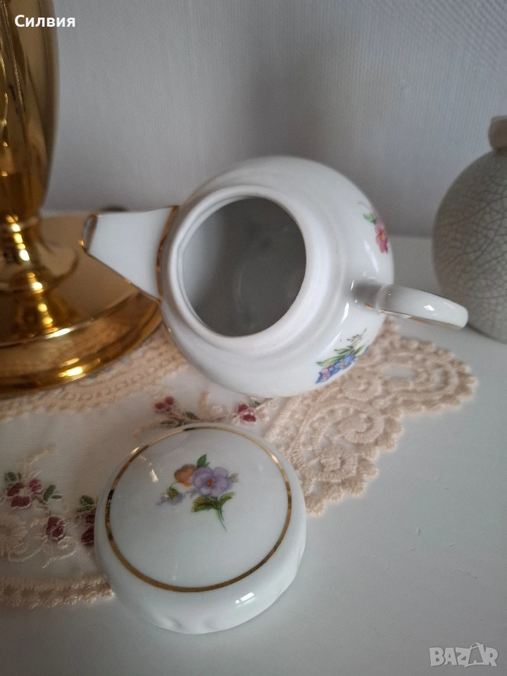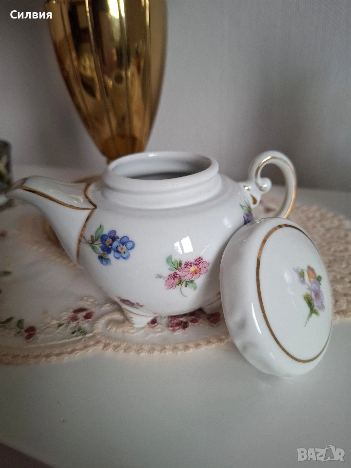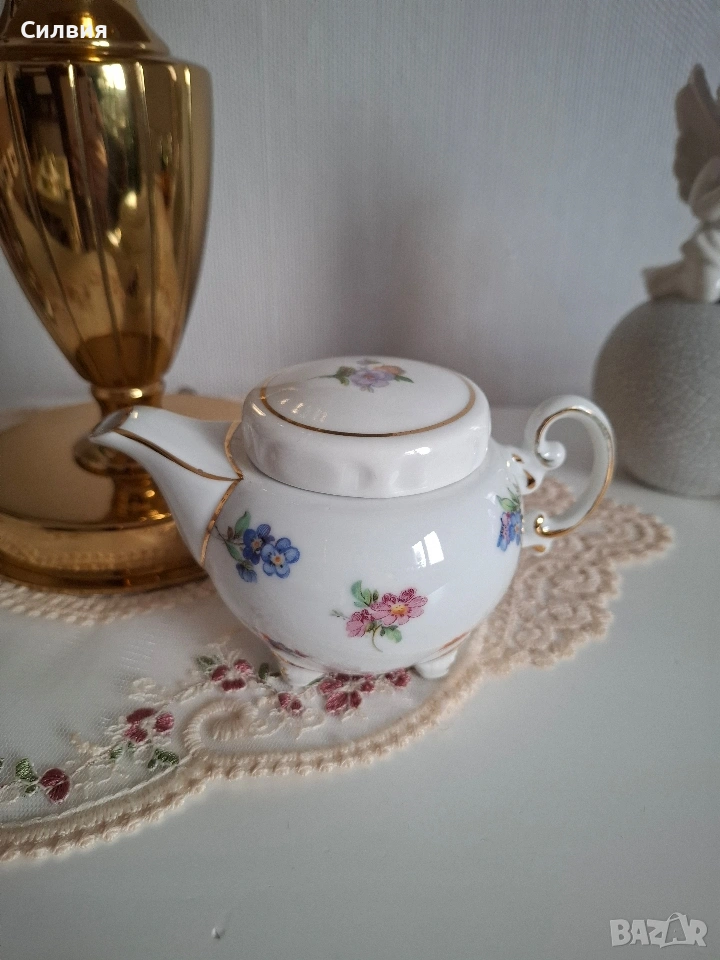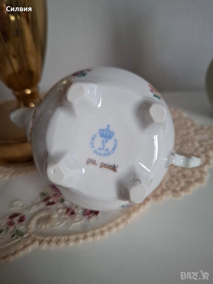 За Клуба на колекционерите: Порцеланово съкровище с механизъм Уважаеми дами и господа, ценители на финия порцелан и редките находки, Предлагам на Вашето внимание един изключителен екземпляр, който заслужава почетно място във всяка сериозна колекция. Този миниатюрен чайник (вместимост 200 мл) не е просто предмет от бита, а доказателство за епоха, в която детайлът е бил издигнат в култ. ✨ Акценти, които ще оценят само истинските познавачи: Инженерно съвършенство: Най-интригуващият елемент е капакът със заключване чрез завъртане. Този специфичен механизъм е рядкост в порцелановото изкуство и е ясен знак за високия клас на изработка. Той превръща предмета в малко техническо бижу. Аристократична осанка: Чайникът е поставен върху три изящни релефни крачета, а дръжката е с богата позлата и рокайлни форми – типичен белег за европейското майсторство. Флорален танц: Ръчно рисуваните цветове (в нюанси на теменужено, розово и оранжево) са запазени с невероятна свежест, контрастирайки на безупречния бял порцелан. Маркировка за автентичност: Ясният печат на дъното (Oscar Schlegelmilch) е Вашият сертификат за качество и историческа стойност. Защо да го притежавате? Този предмет носи духа на старите салони с тежки завеси и аромат на висок клас чай. Той е перфектен акцент за Вашата витрина или ценен подарък за член на Клуба, който знае как да цени рядкото и красивото. Състояние: Музейно качество. Позлатата е непокътната, а механизмът на капака работи безупречно.