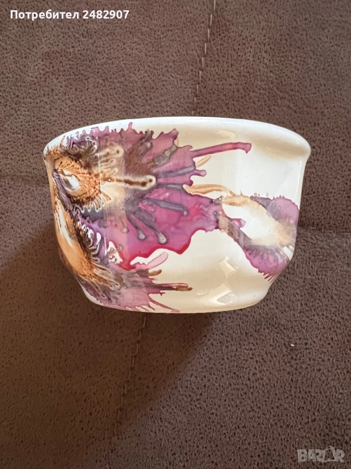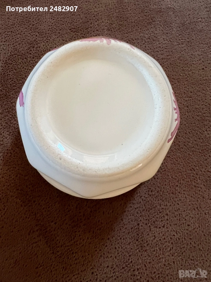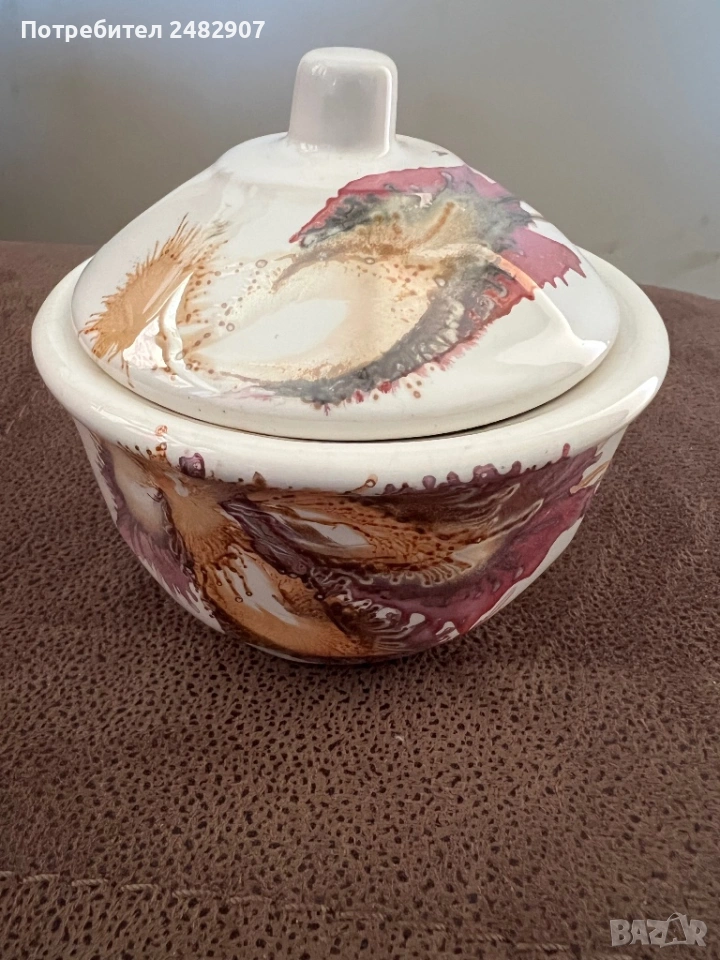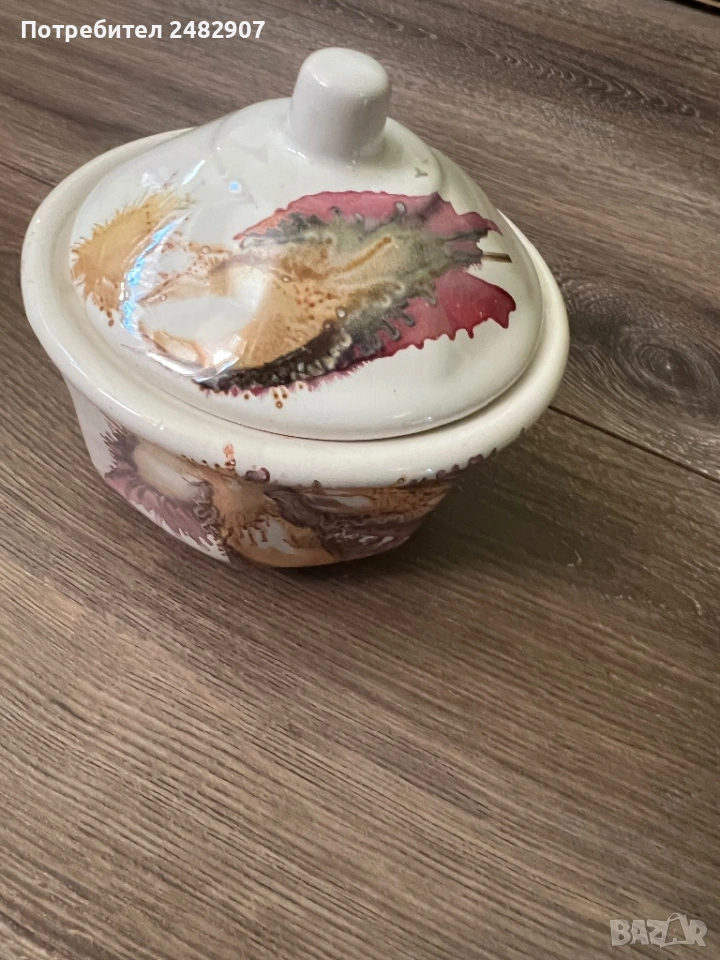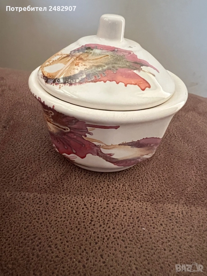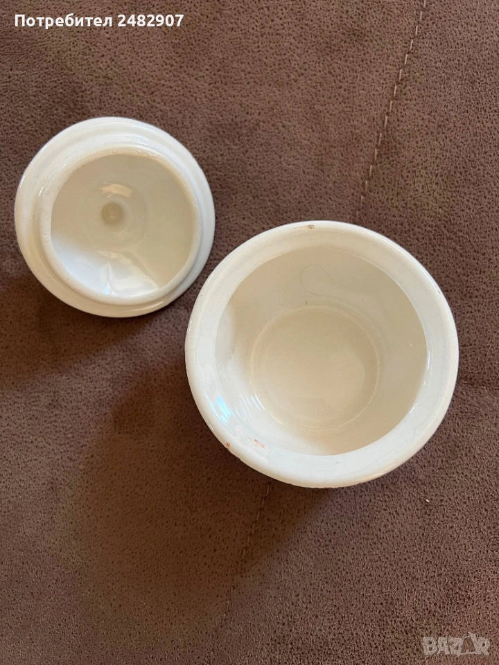Много стара порцеланова захарница с капаче - глазирана. Диаметър в долната част - 6,5 см, диаметър в горната част - 10 см, височина - 6 см, височина от долу до горната част на капачето - около 10 см. Чисто нова, не е използвана, много красива.