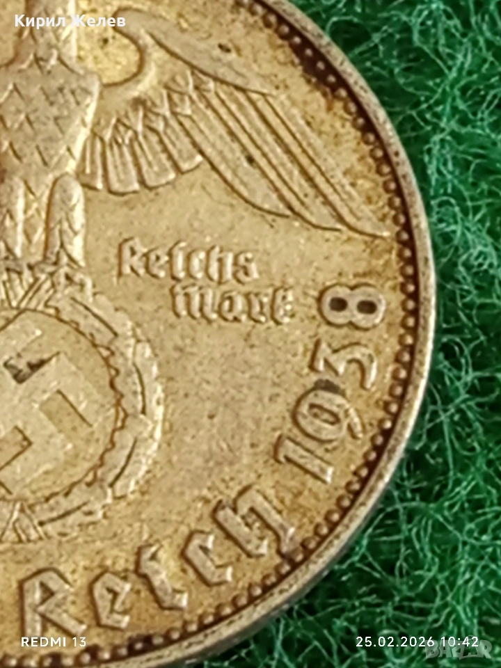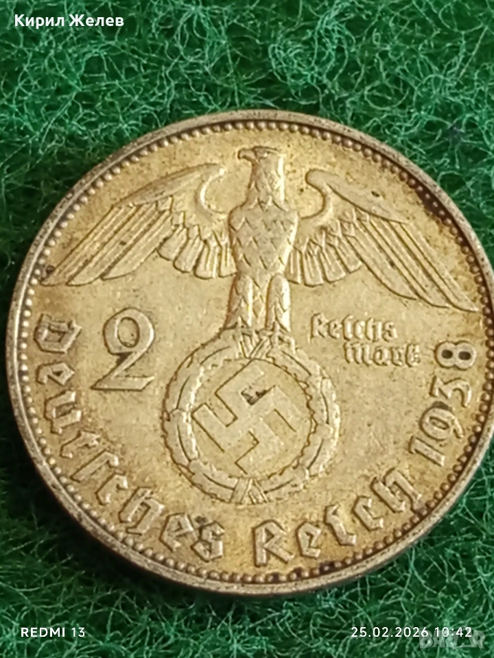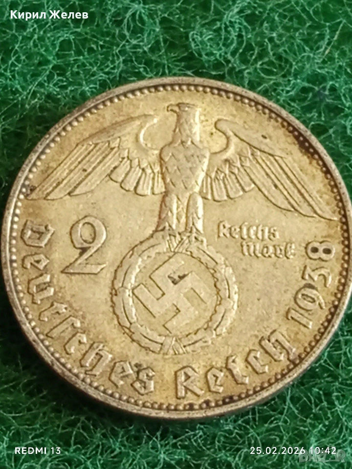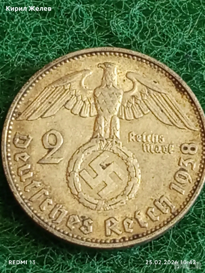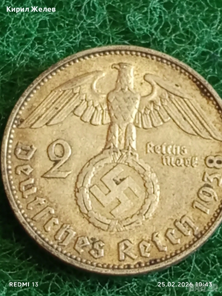Сребърна монета 2 райхсмарки 1938г. Германия Трети Райх с Свастика за КОЛЕКЦИОНЕРИ 37821 → Обява 53615216