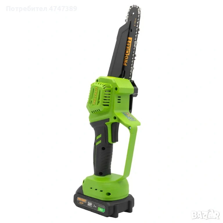 Акумулаторен безчетков верижен трион Procraft PKA46 20V с 2 шини, 2 вериги, 2 батерии и зарядно, подходящ за подрязване и рязане до 200 мм.