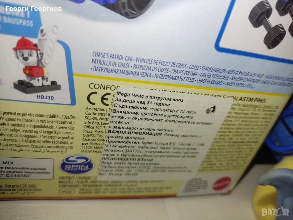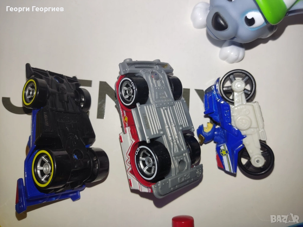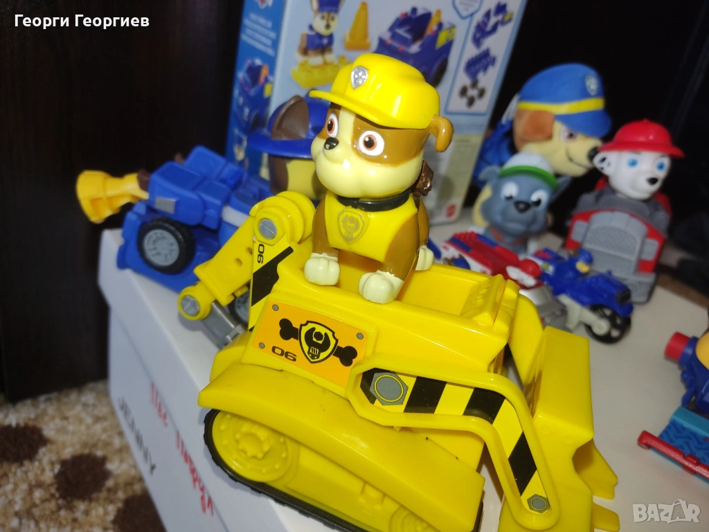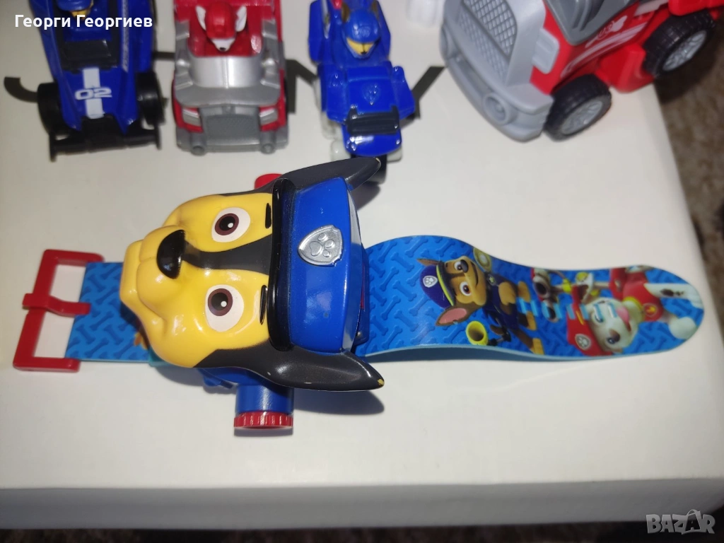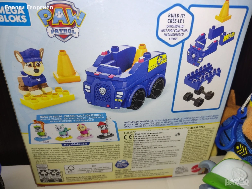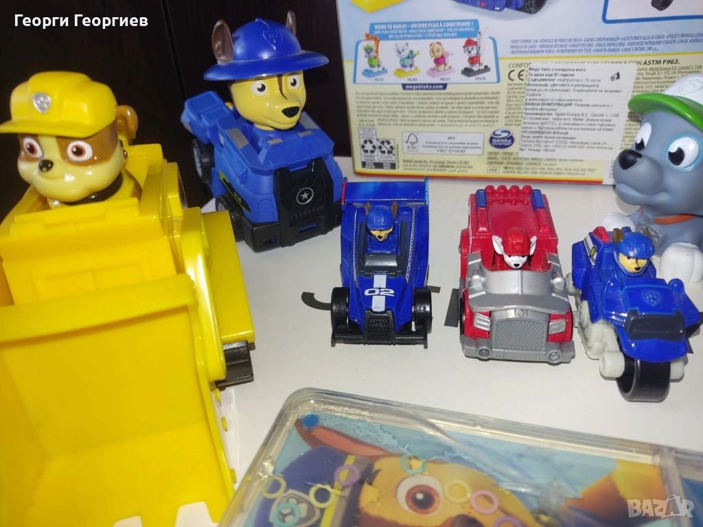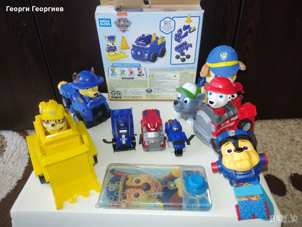 Лот играчки Пес Патрул - много фигурки с превозни средства, часовник с прожекция, сглобяем комплект Чейс - тип бебешко Лего и една игра с хлаки във вода за низане. Продава се всичко на обща цена 20евро.