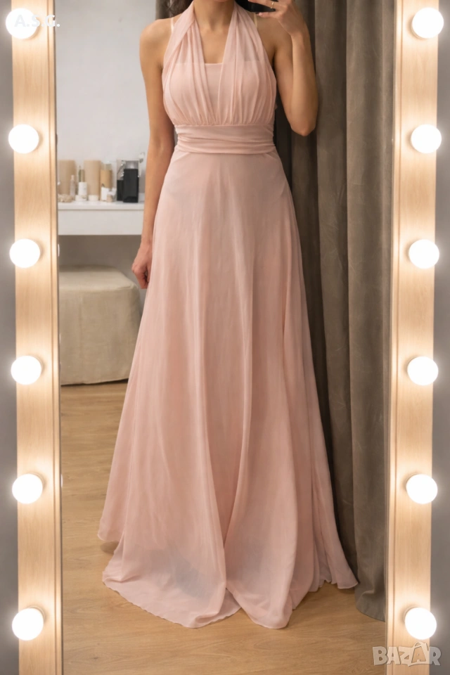 Нежна бледо розова дълга рокля с тюл и подплата.