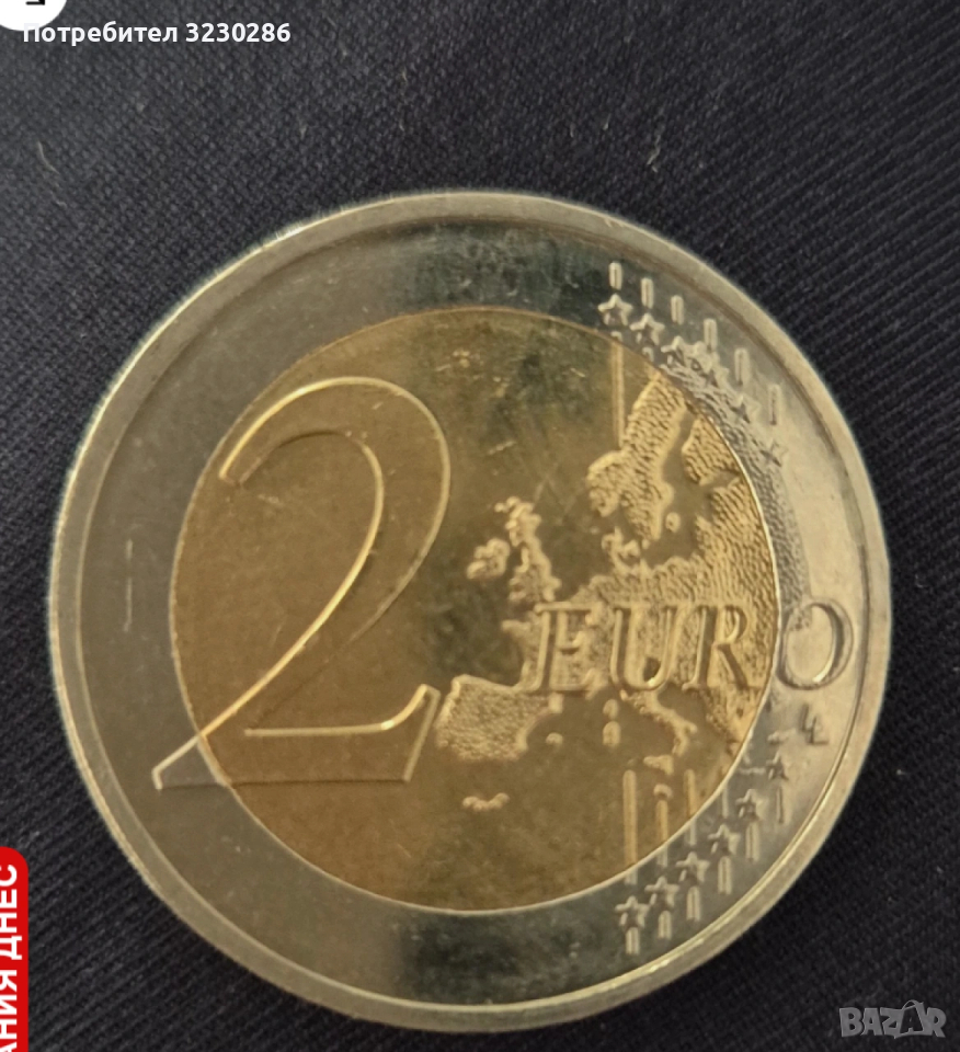 Реверс: Обратната страна на монетата показва номинала от 2 евро и изобразява карта на Европа.