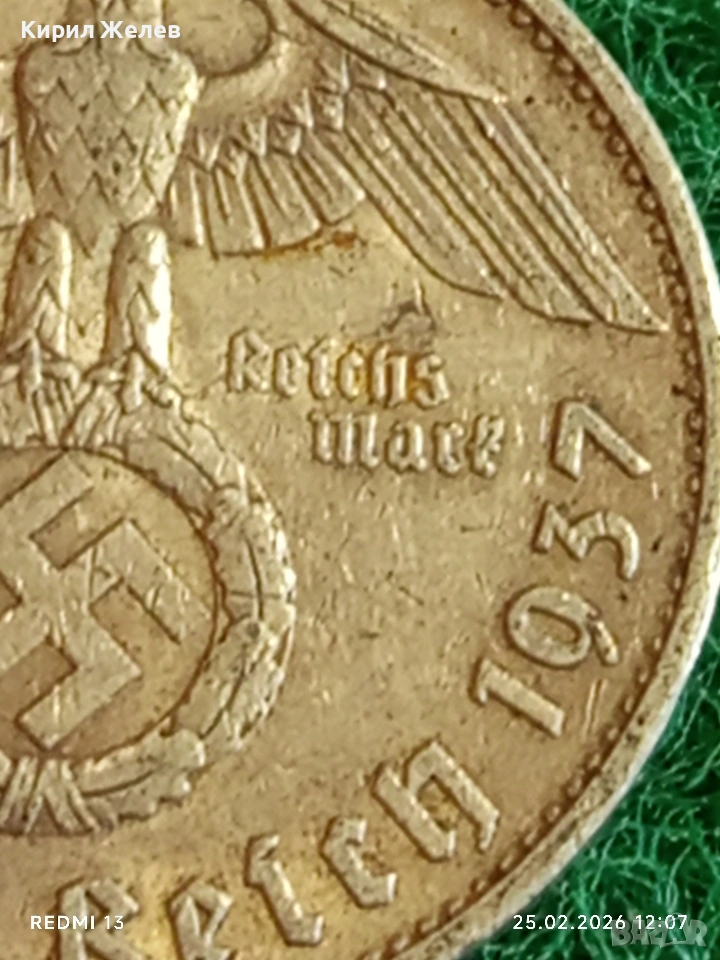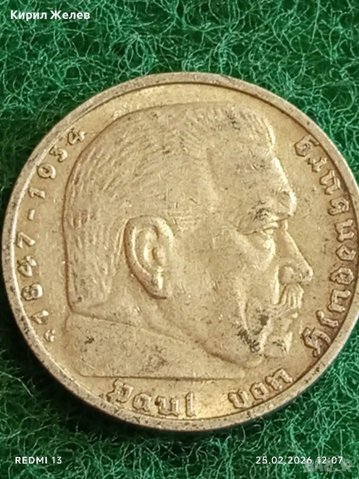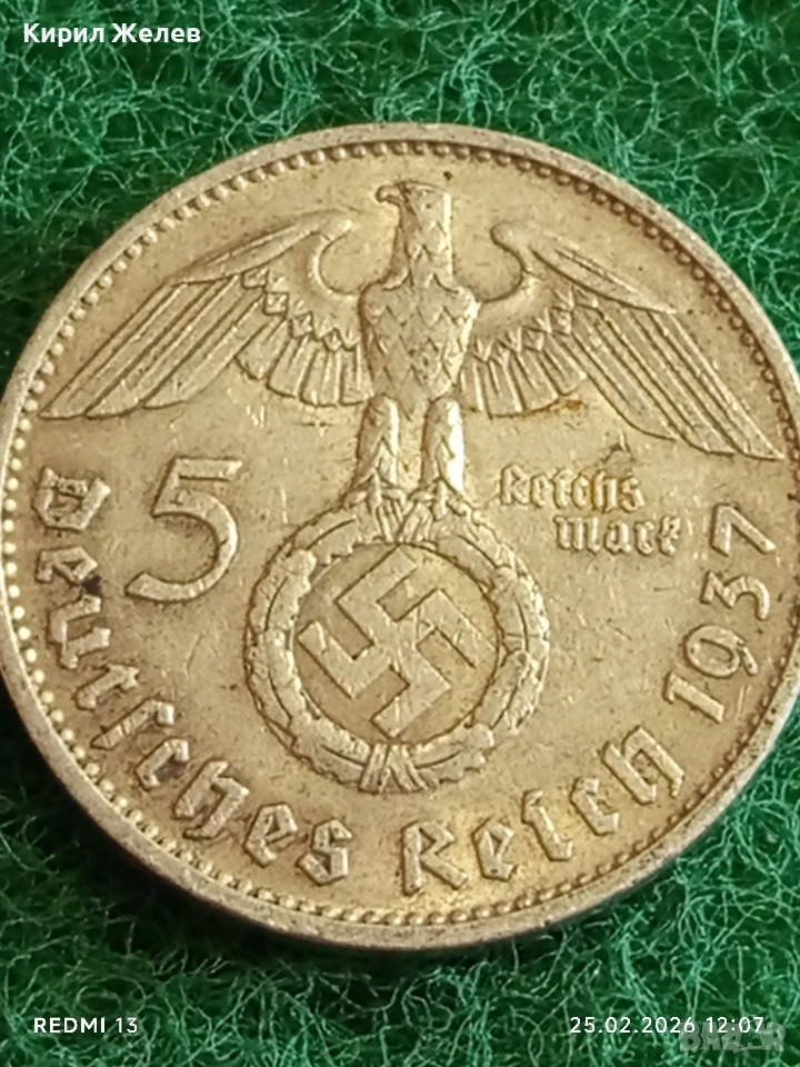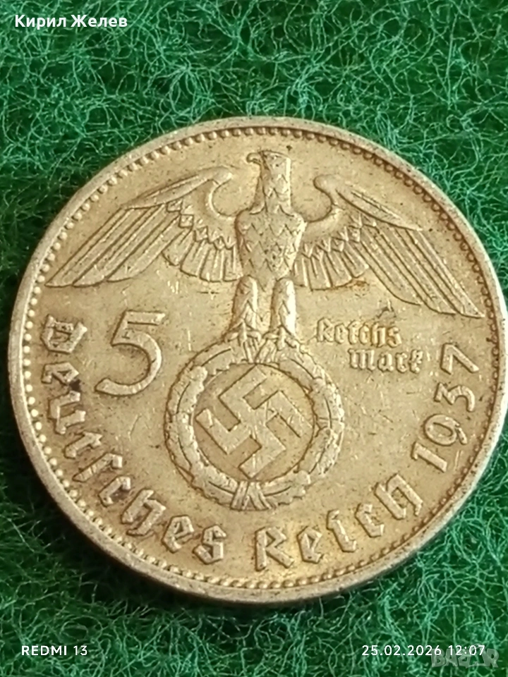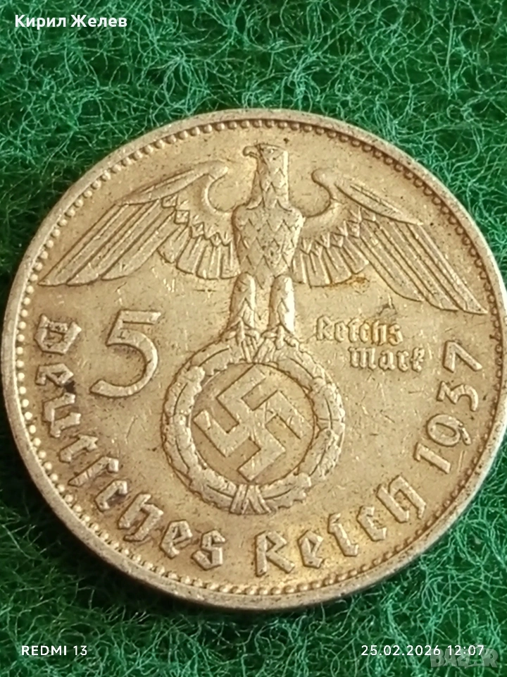 Сребърна монета 5 райхсмарки 1937г. Германия Трети Райх с Свастика за КОЛЕКЦИОНЕРИ 26432