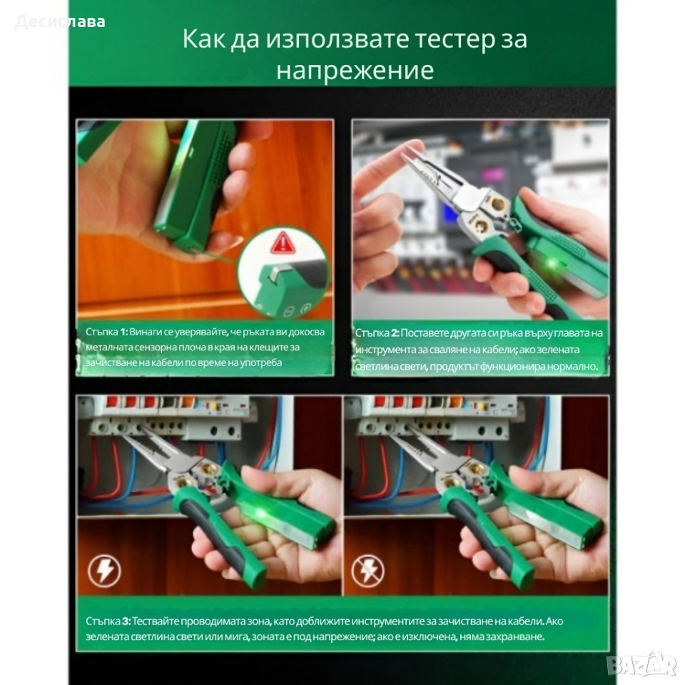 Материал: неръждаема стомана с ергономична гумена дръжка Размери: 20.7 см дължина x 8 см ширина Цвят: зелен с черни акценти Съвместимост: AWG 18, 14, 12, 10; 6/1.0; 1.5; 2.0; 2.5; 4.0 mm²; Cable Cape 25 mm²; окабеляване 2×1.5 mm² Функции: оголване, рязане (25 mm²), пресоване, кримпване, разклоняване, навиване, разделяне Тестер за напрежение: 12V–250V Допълнително: заключващ механизъм и пружинен отварящ механизъм за удобство