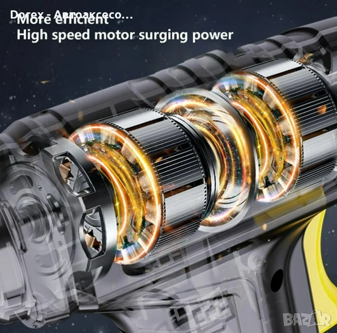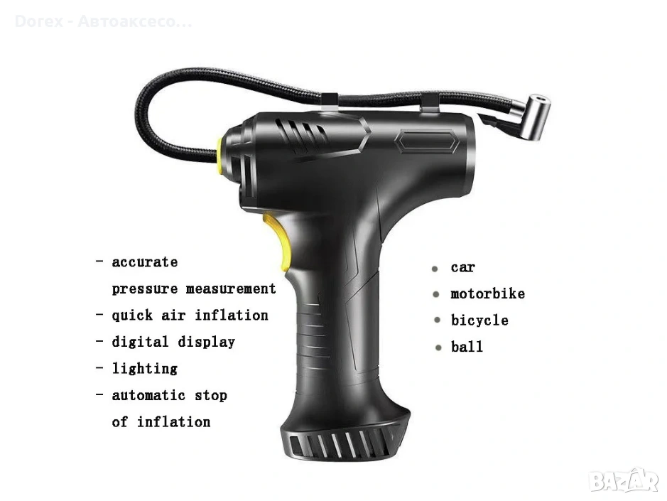 Устройството осигурява максимален въздушен поток от 30 литра в минута и позволява бързо напомпване на гума средно за около 5 минути. В комплекта са включени 3 дюзи с различни диаметри за универсално приложение. 🚗
