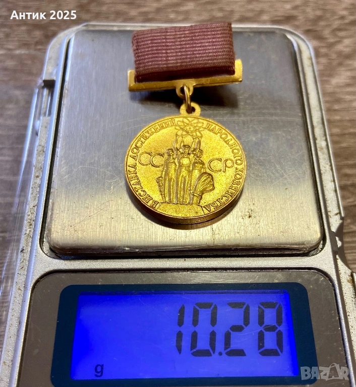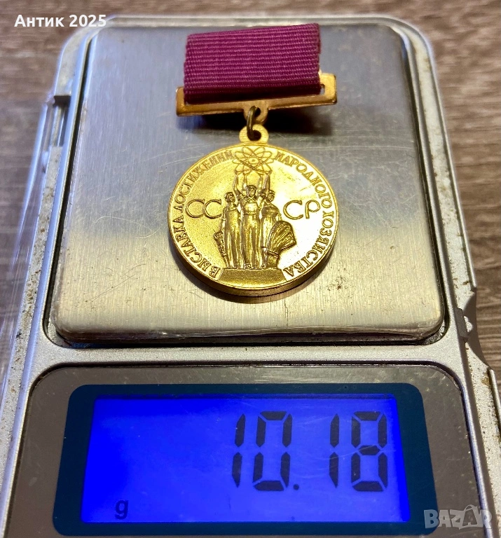 винтидж медали на СССР „За постижения в народното стопанство на СССР“. На лицевата страна — релефно изображение на работници със символ на атома и надпис „На участника в постиженията на народното стопанство на СССР“, на обратната страна — надпис „За постижения в народното стопанство на СССР“.