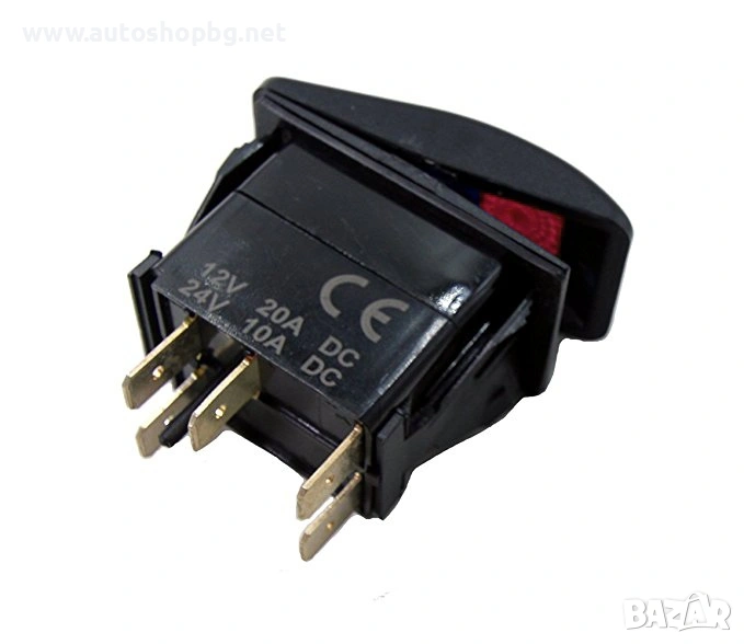 Бутон/копче ON/OFF с надпис HORN и червена подсветка, подходящо за всички 12–24V акумулаторни инсталации.