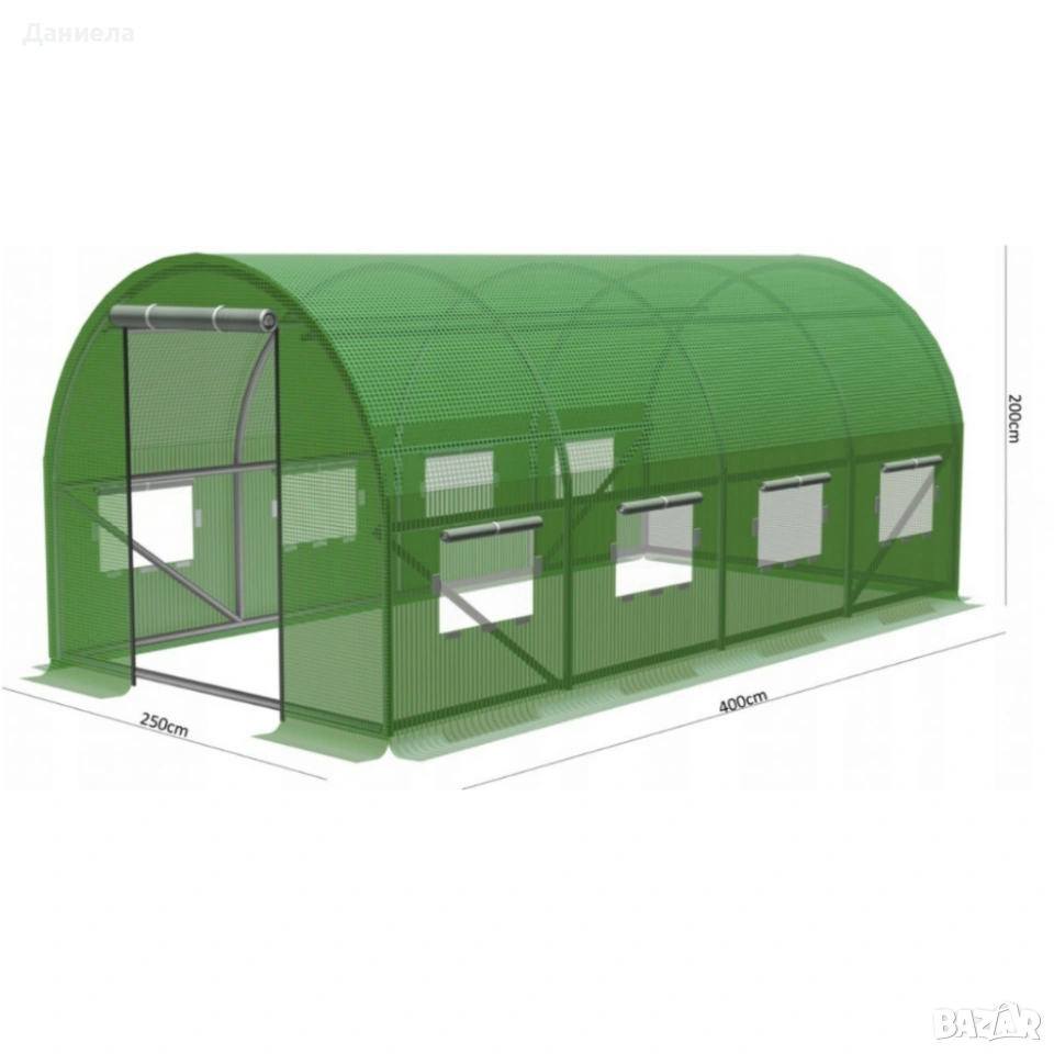 Спецификацията прави избора лесен и уверен: Размери: 4 × 2,5 × 2 м Сегменти: 4 Фолио: PE 140 г/м² с UV4 филтър Вградена PP мрежа за усилване Рамка: поцинкована стомана, тръби Ø 25 мм, дебелина 0,65 мм Прозорци: 8 броя с мрежи против комари, закрепени с велкро Врати: ролкови с цип, възможност за навиване и фиксиране Допълнителни елементи: колчета, връзки за връзване на растения, 2 тръби за увивни растения, 8 стълба 11 × 120 см Долен як за заравяне в почвата за допълнителна защита