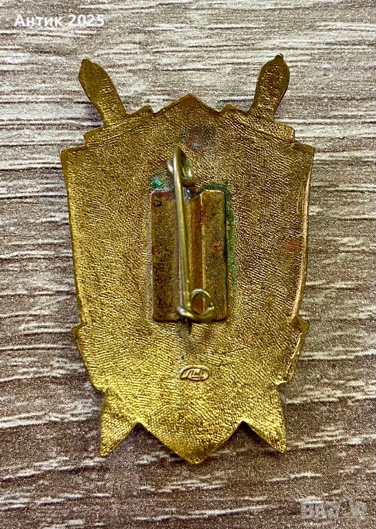 На обратната страна има класическо иглено закрепване (игла) с фиксатор, което осигурява надеждно прикрепване към облекло. Основата има характерна грапава текстура. Налице е производствено клеймо (овален печат), което потвърждава автентичността и фабричното изработване на знака от времето на СССР. Има леки следи от времето и патина, съответстващи на възрастта на изделието.