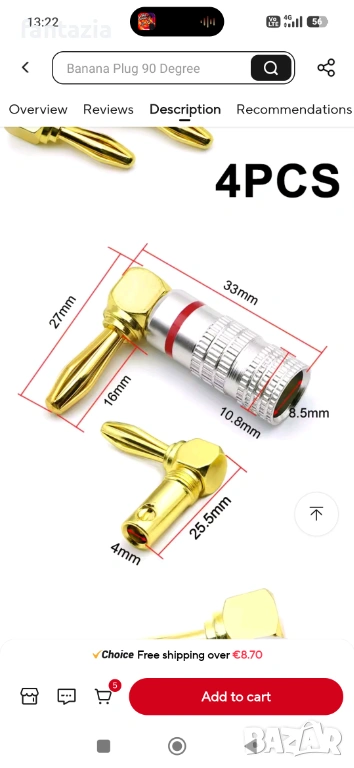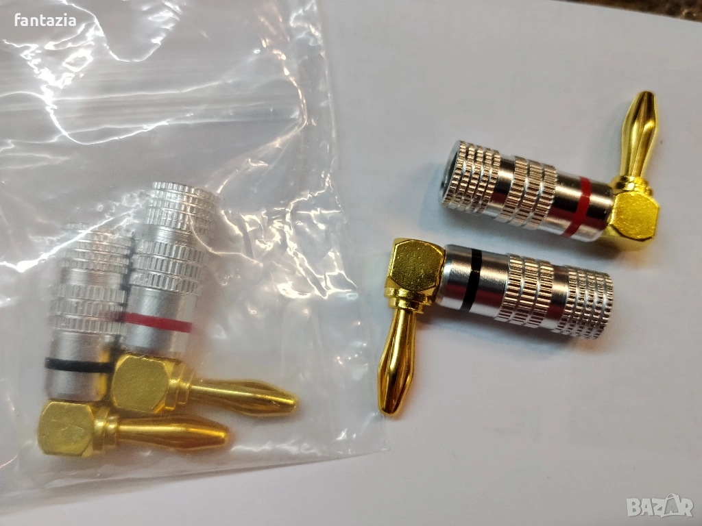 Продавам 2 комплекта банан - щекери 4мм, позлатени, нови и неизползвани, закупени от алиекспрес, на цената на която са закупени.