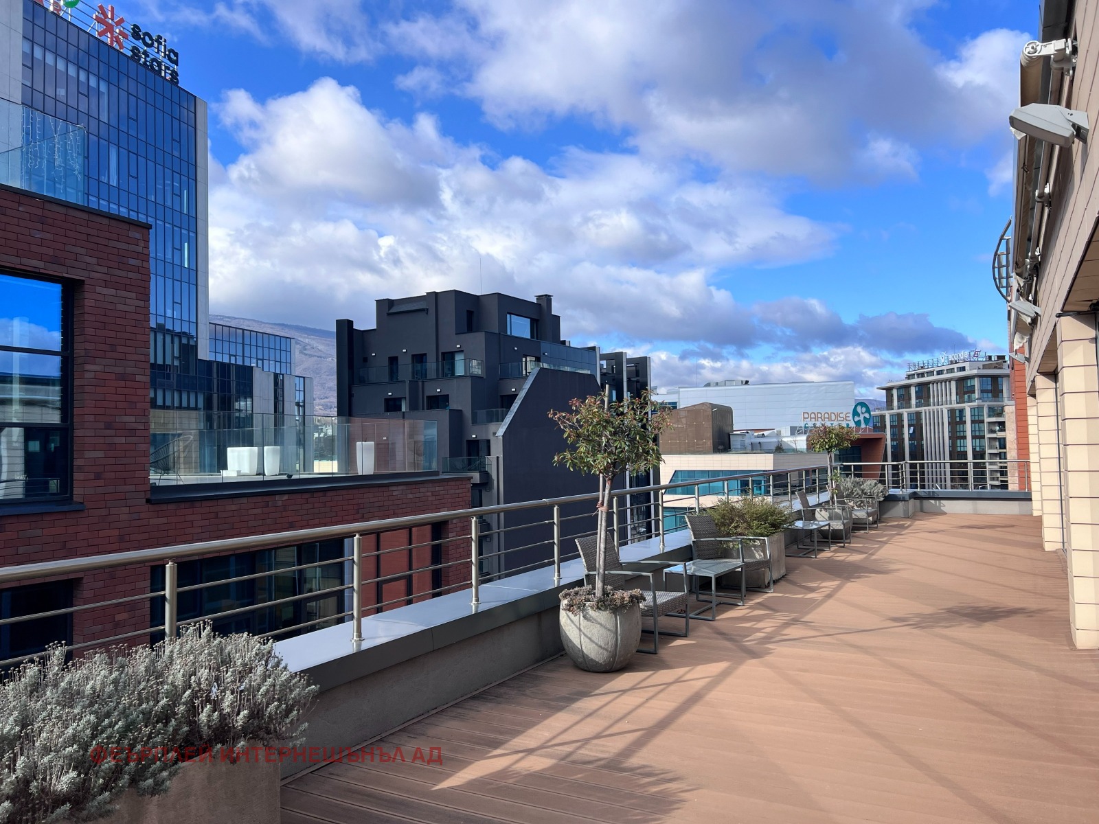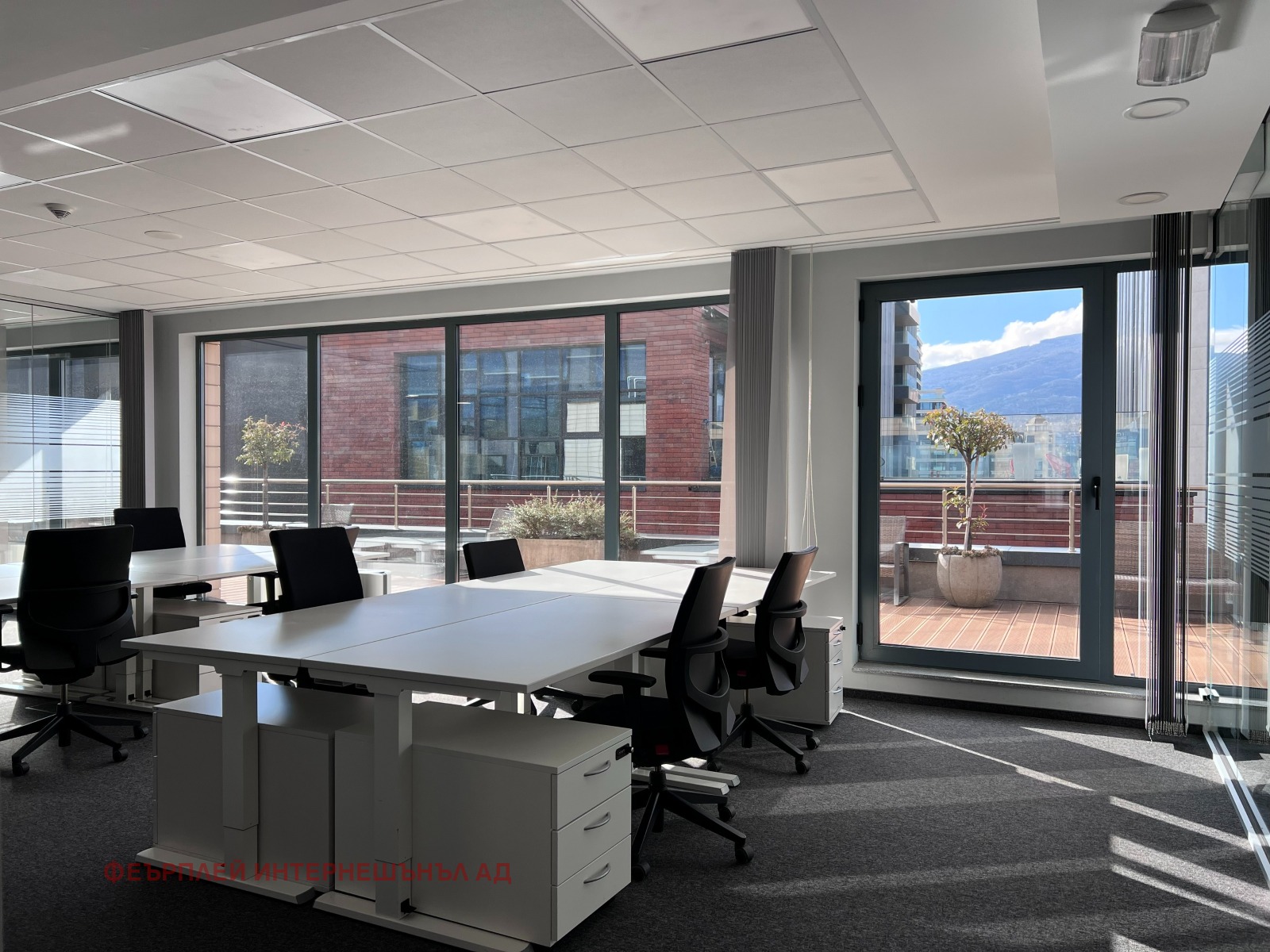 Етажът е просторен, представителен и включва: конферентна зала, самостоятелен кабинет, focus room, сървърно помещение и модерна кухня, оборудвана с хладилник и съдомиялна. Двете панорамни тераси разкриват впечатляващи гледки - към планината и към града, създавайки усещане за простор и вдъхновяваща работна атмосфера.