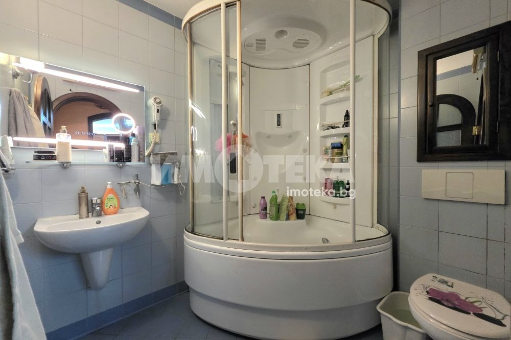 Кухнята и цялостното обзавеждане, в това число вратите и парапетите са поръчкови, италиански, череша, естествен фурнир. Кухненският плот е от гранит. Подовете също са гранит. В спалнята - естествен паркет.